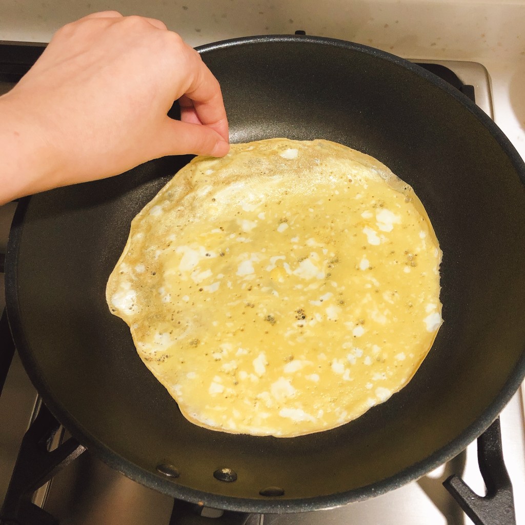 雞蛋(2顆)打成蛋液後,用刷子均勻在平底鍋上塗抹橄欖油,加熱平底鍋至手心在鍋子上方稍微無法忍受的熱度,倒入攪拌均勻的雞蛋蛋液,拿起平底鍋稍微搖晃使蛋液分布均勻後,關火,蓋鍋蓋悶1分鐘。再開小火加熱30秒,漂亮的圓形煎蛋皮就可以用手/筷子整片撕下來。放置熟食砧板上放涼後,由下而上把蛋皮捲起來,留意寬度均等切成條狀,漂亮的黃金蛋絲就完成囉!