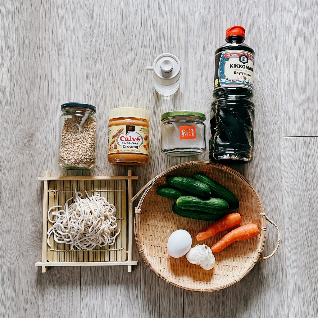 將蒜頭(3瓣)磨成泥,加入稍早磨好的白芝麻碎、Calvé 花生醬(3大匙)、醬油(2大匙)、白醋(1大匙)、砂糖(1茶匙)、水(5大匙)攪拌均勻,備用
