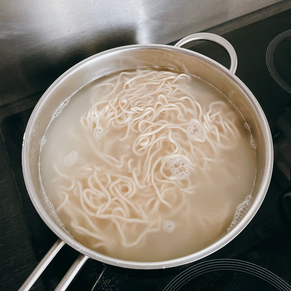 水煮沸後,將新鮮麵條放入,依個人喜好麵條軟硬度煮約4-6分鐘。