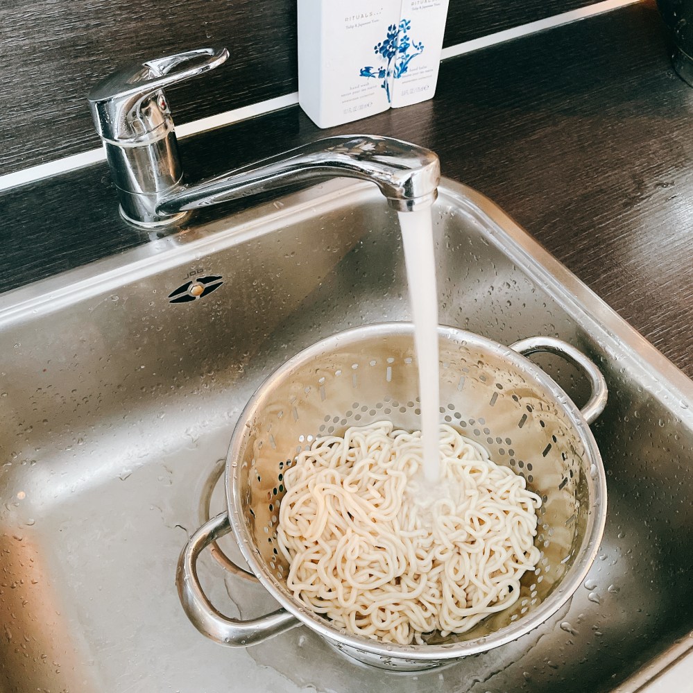 直接在水槽準備廚房濾盆,水龍頭轉到冷水、打開水,將麵條倒入濾盆內,使用夾子/徒手將麵條充分洗去澱粉水。再泡在冰水中冰鎮5分鐘,完成。