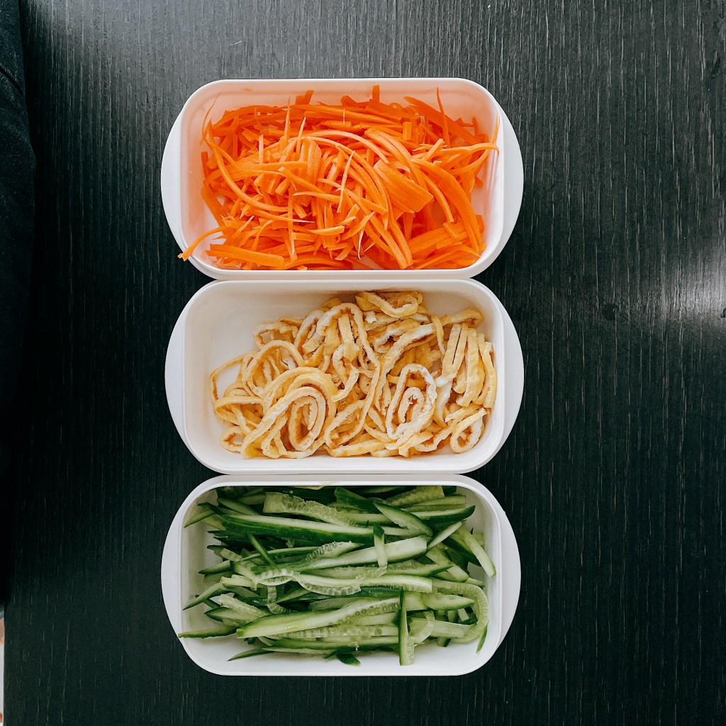 涼麵配菜的大原則是一定要有紅蘿蔔和小黃瓜,其他的蛋絲/雞絲/火腿絲可依個人口味和喜好自行選擇。若要口感一致,可使用刨絲器輔助;但如果沒有刨絲器,用刀子切絲訓練一下刀工也是可以。