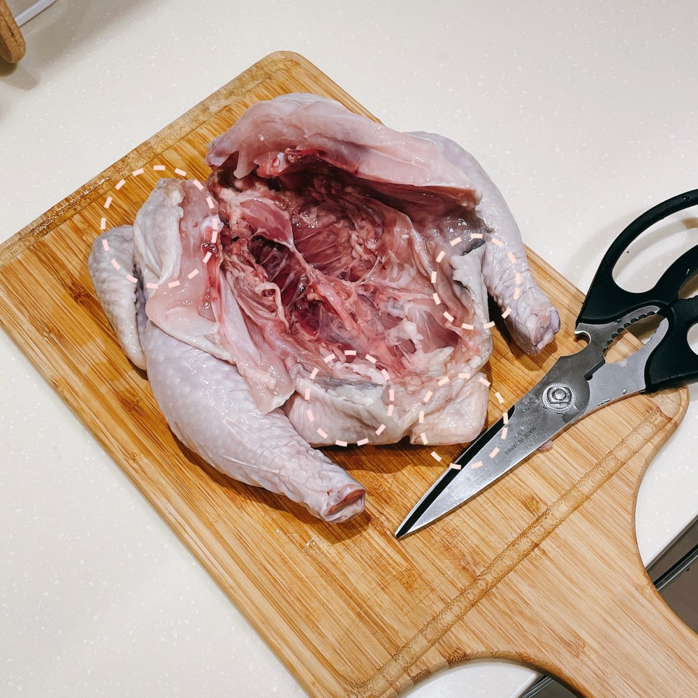 使用廚房剪刀,沿著雞胸骨用大剪刀將放牧雞剪開,再把雞胸附近、雞翅和尾部多餘的雞皮脂肪減掉。這樣燉雞湯比較清爽不會太油膩。