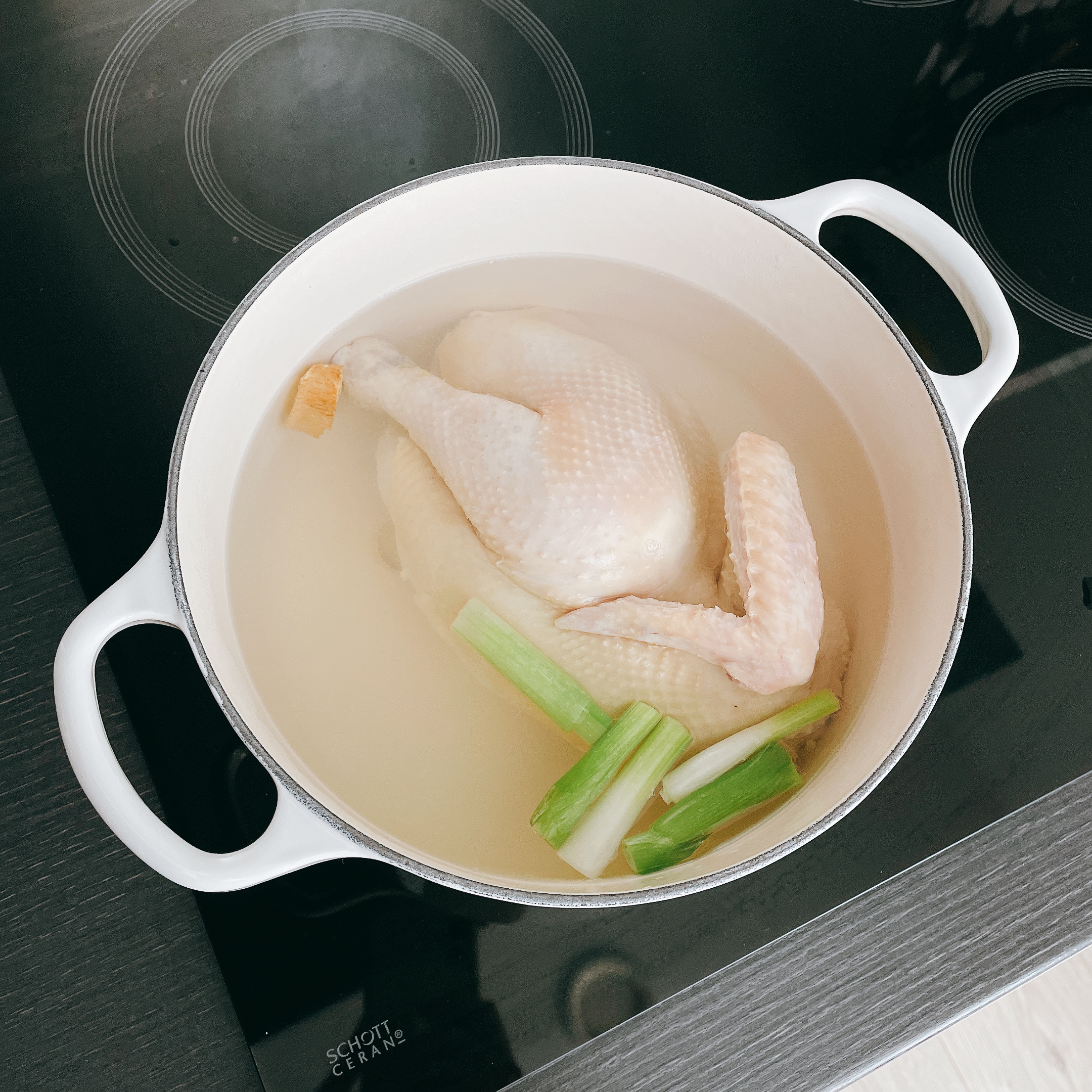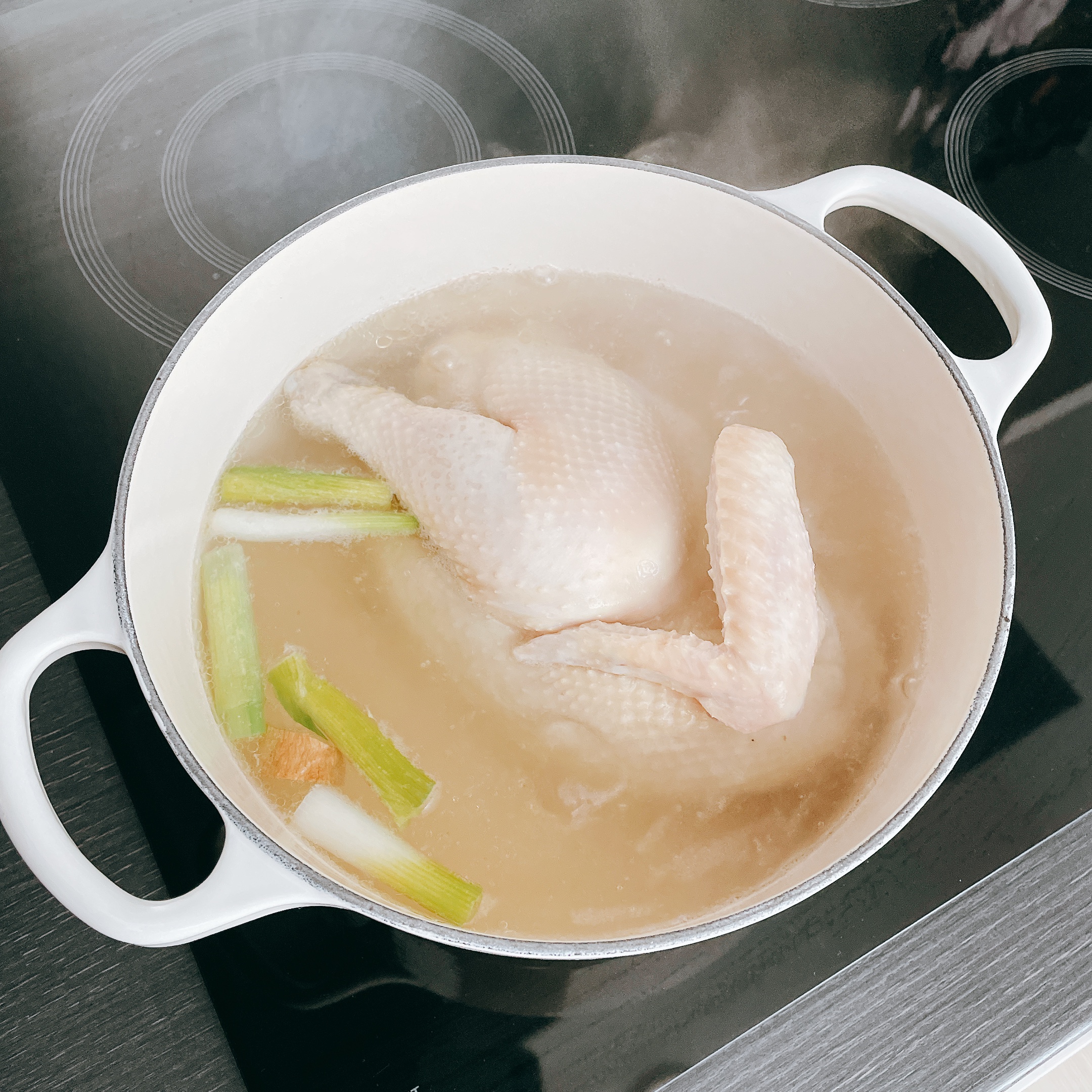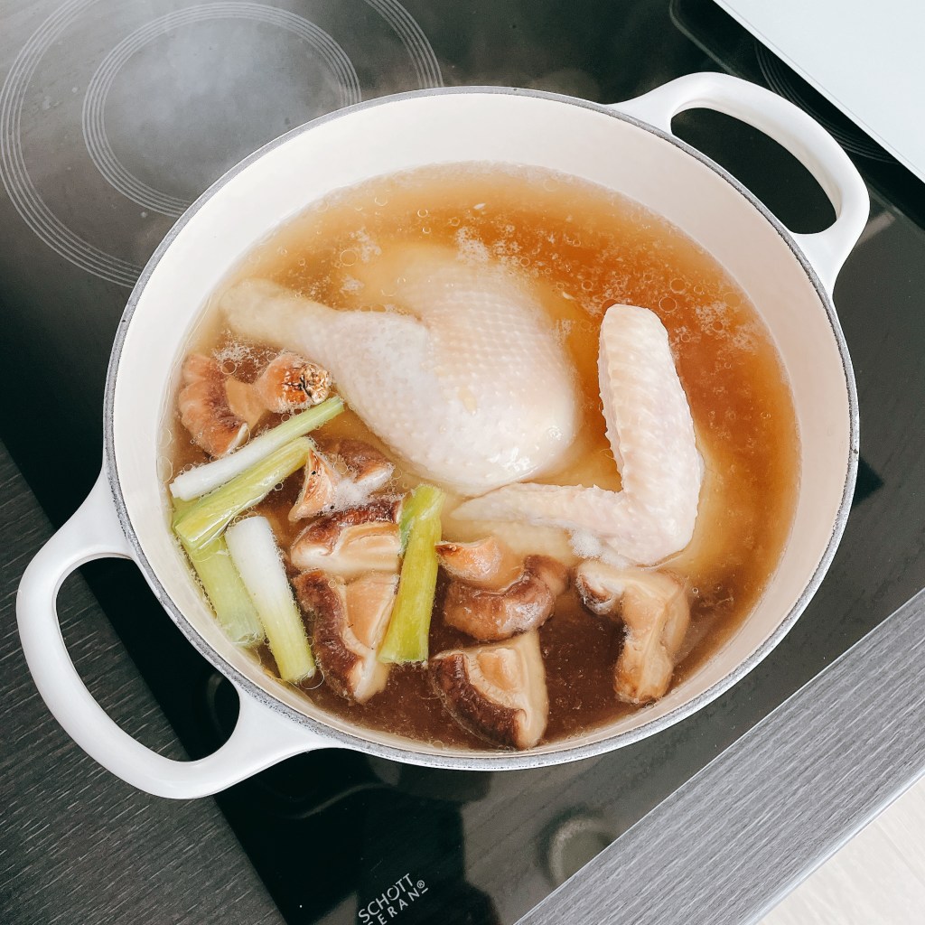 將放牧雞(半隻)、蔥段(10g)、生薑(5g)切片放進Le Creuset鑄鐵鍋中,加入水(1000ml)煮到水滾、用濾網確實撇乾浮油和肉渣,