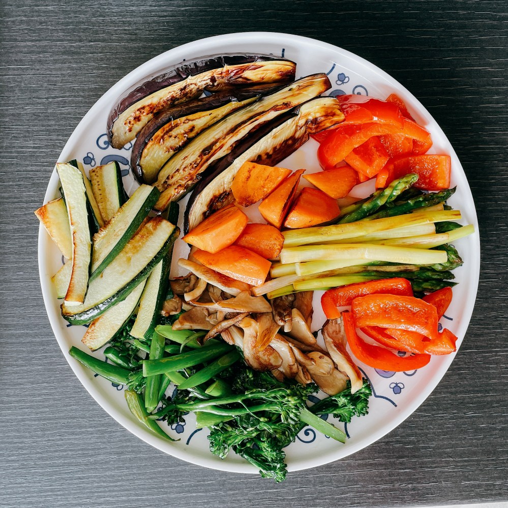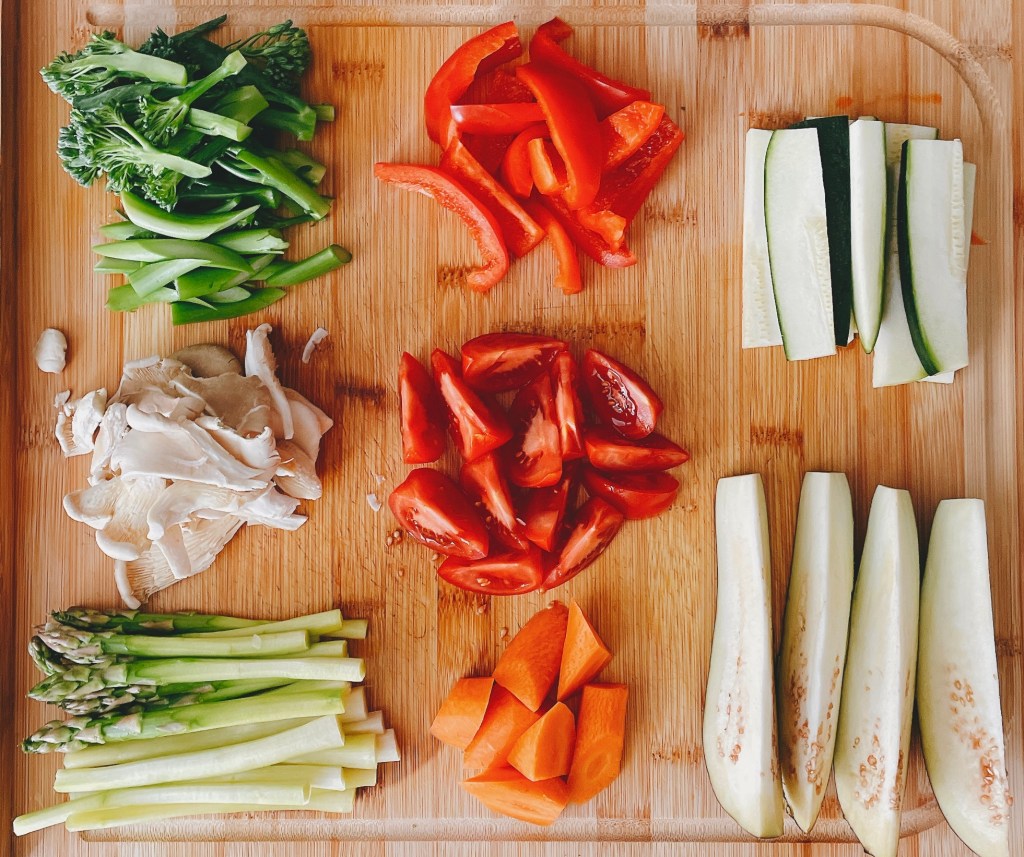 茄子(半顆)切長片、櫛瓜(100g)切長片、紅甜椒(50g)去籽切長片、青花筍(100g)切成小段、蘆筍(10根)削皮對切、紅蘿蔔(50g)削皮滾刀切塊、秀珍菇(50g)手撕成小塊,