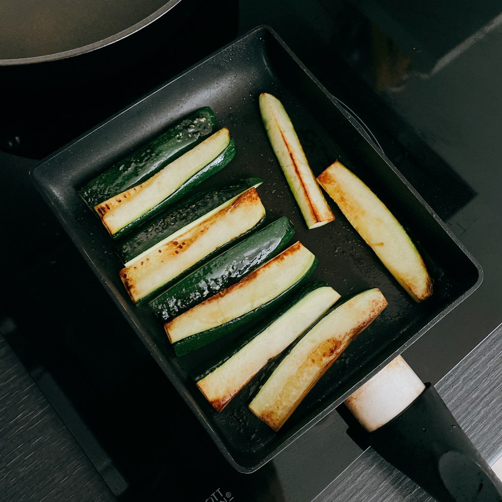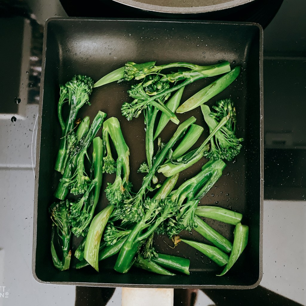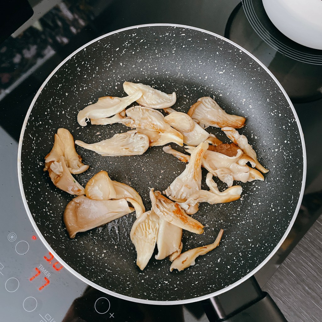 平底鍋加適量橄欖油,將所有蔬菜、蕈菇煎至上色;