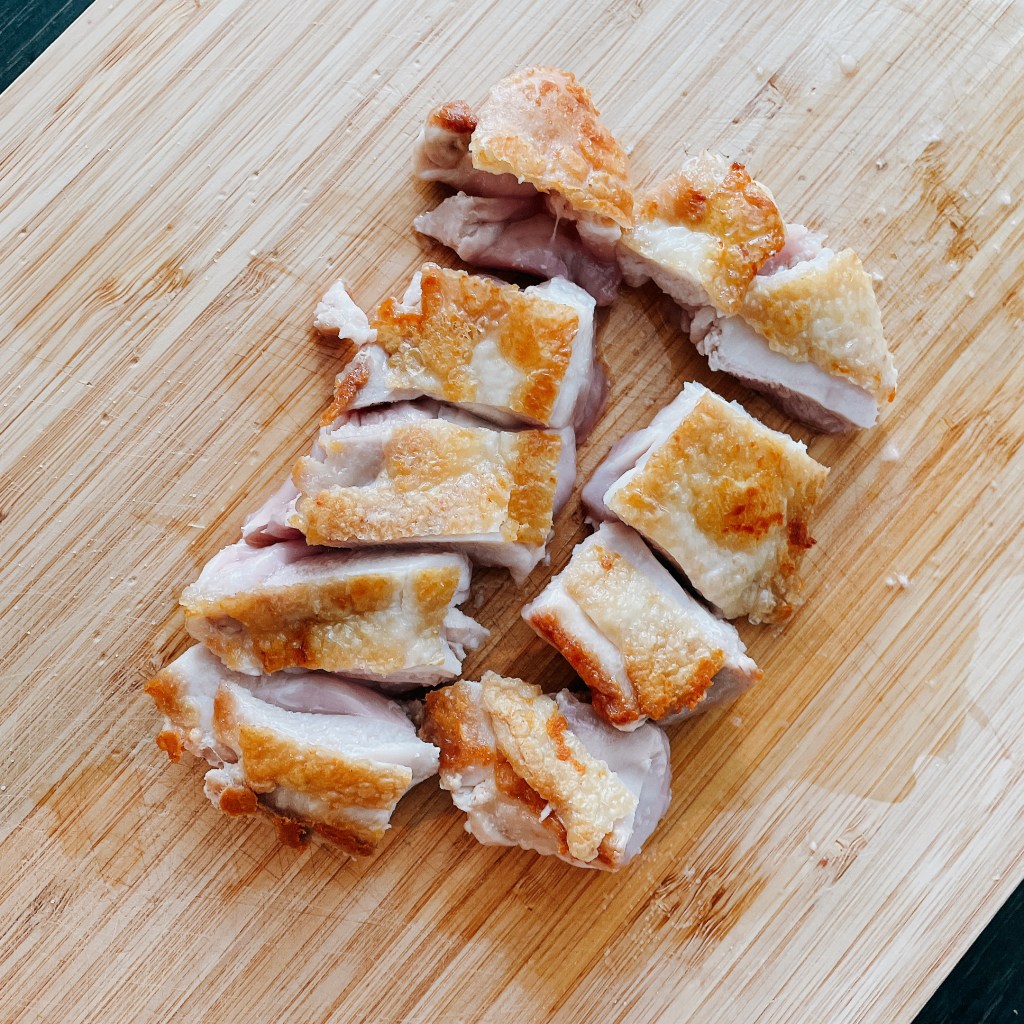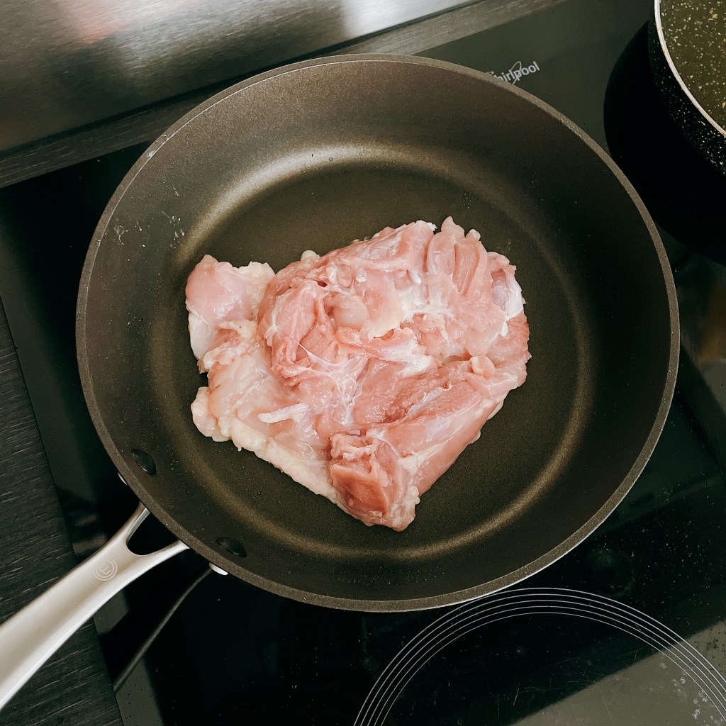 將雞腿排(1片)皮朝下乾煎至雞皮成金黃色,再切成適合入口的大小,備用
