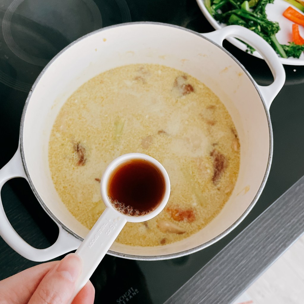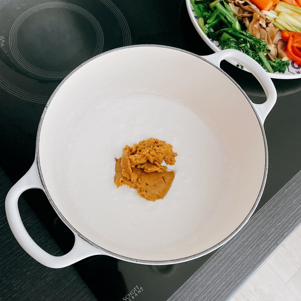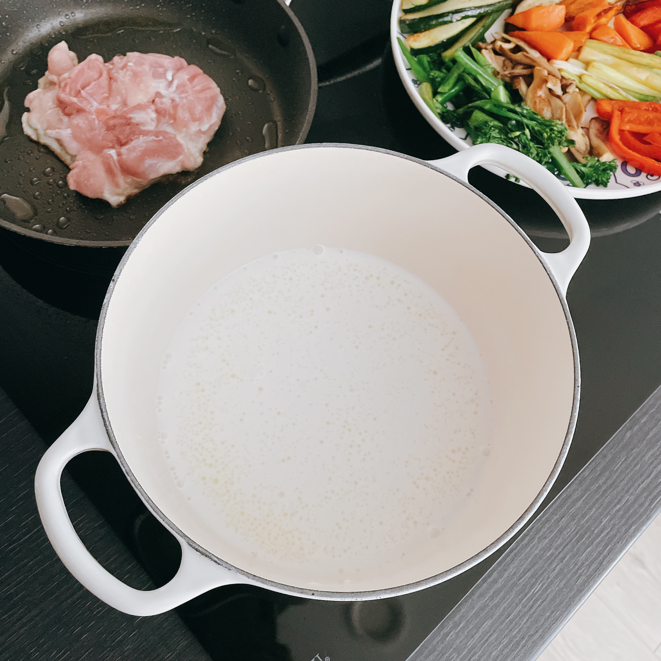 Le Crueset 鑄鐵鍋熱鍋後,加入適量橄欖油並和椰奶(400ml)一起炒至椰奶質地變濃綢絲滑。