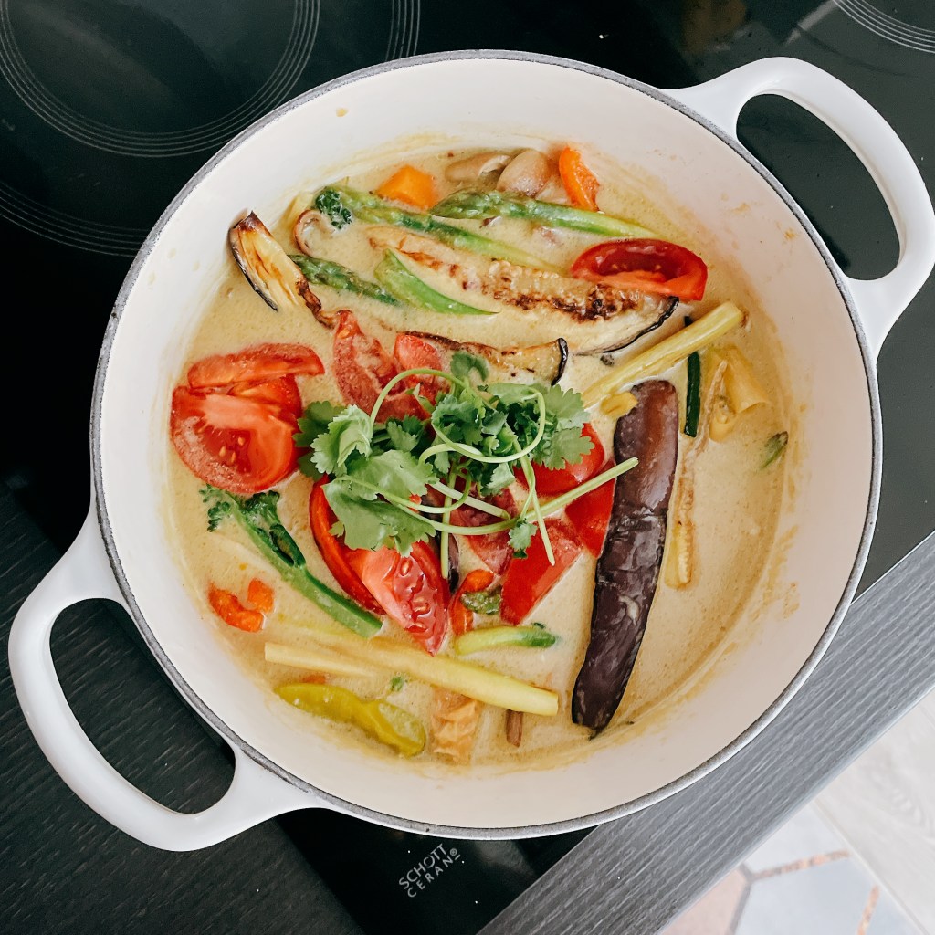 最後加入剩下的炙燒過的蔬菜(櫛瓜、青花筍、蘆筍、茄子、紅甜椒)以及切成小瓣的牛番茄(100g),確認綠咖哩的味道、若不夠鹹可自行斟酌加點鹽巴,熄火。蓋回鍋蓋,用餘熱悶煮5~10分鐘,完成。