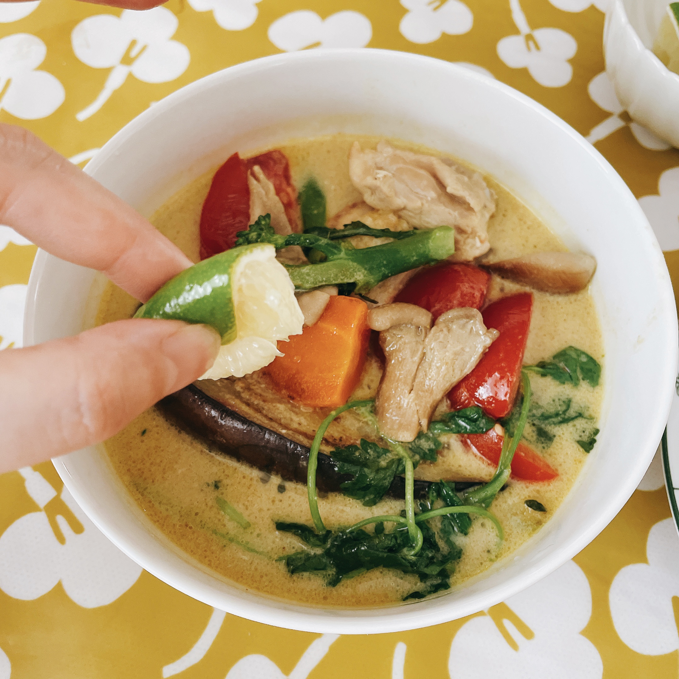 吃之前記得加香菜(依個人口味適量)並淋上新鮮的萊姆汁,以「酸、辣、甜」交織而成的【雞肉野菜泰式綠咖哩】就能美味上桌啦!