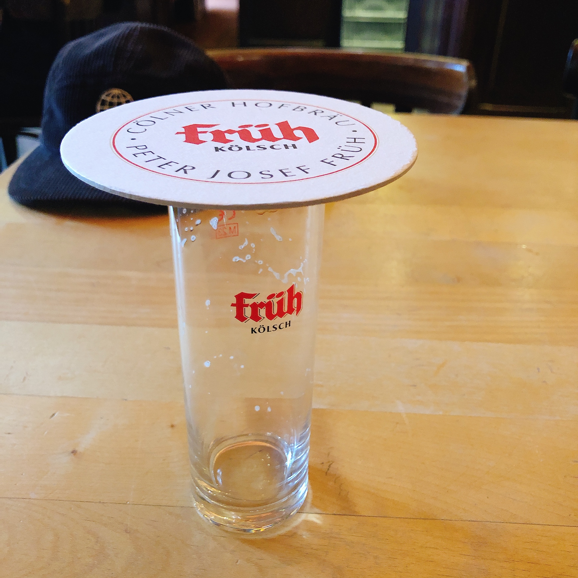 科隆啤酒(Kölsch)使用細長型的啤酒杯,容量只有200cc、大概喝3口就沒了。這種特殊的小容量,據說是為了讓客人喝到的啤酒永遠都是冰涼沁心的完美狀態。在科隆的啤酒花園或餐酒館,服務生都會『滿場飛』看到客人酒杯快見底就會幫你斟滿啤酒,如果喝夠了、就把杯墊蓋在杯子上,服務生就知道不需再斟酒囉!
