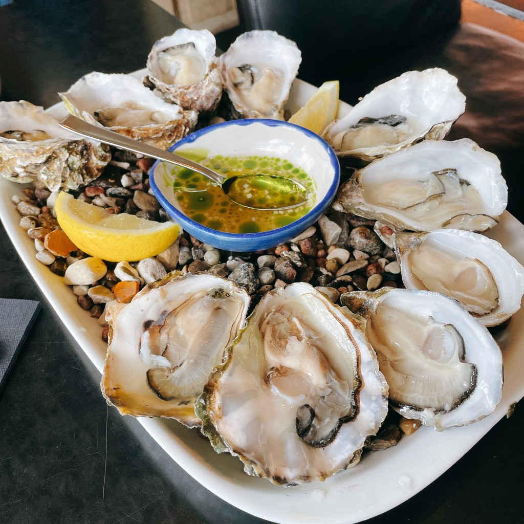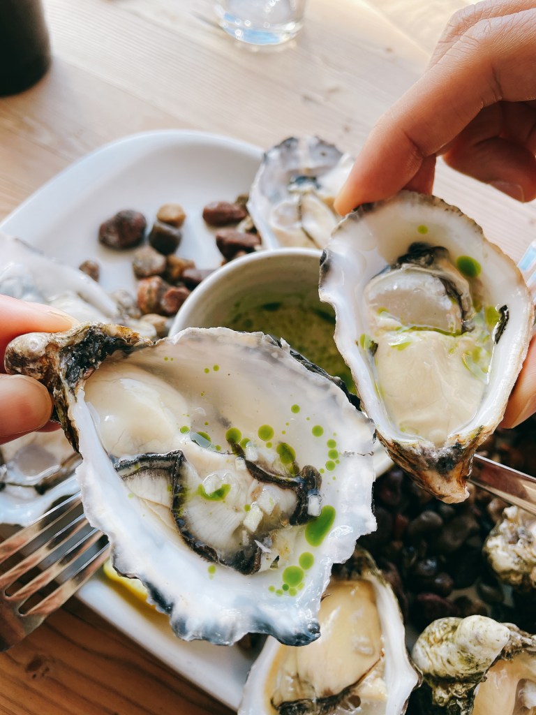 可以一口氣吃到五種不同品種的生蠔:白珍珠生蠔(Perle Blanche)、吉娜朵生蠔(Gillardeau)、擁有海水鹹味和肉一般鮮美的Antilope生蠔、清爽鮮甜的Baby kys生蠔、以及「外來種」太平洋牡蠣(Gigas)。