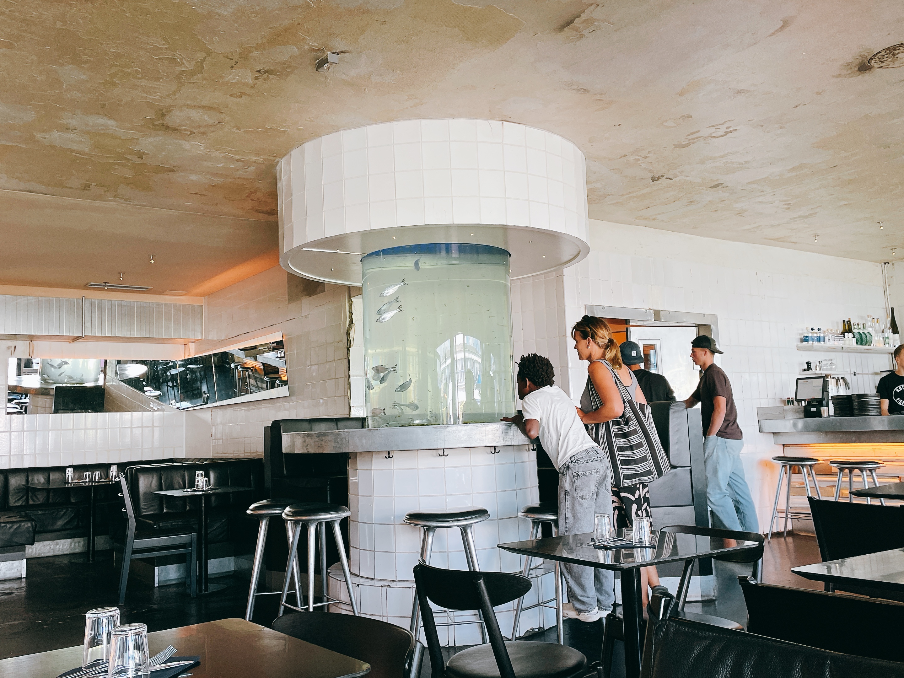 【Kødbyens Fiskebar】室內座位很像水族館的某個角落,客人經過圓柱形的大魚缸總是新奇地駐足觀賞。然後,我覺得最魔幻的就是他們家廁所。從類似逃生門的地方進去後,廁所運用大量鏡子堆疊出哈哈鏡的景深效果,搭配水滿出來滴滴噠噠的聲效如果晚上來真的會嚇到挫尿。