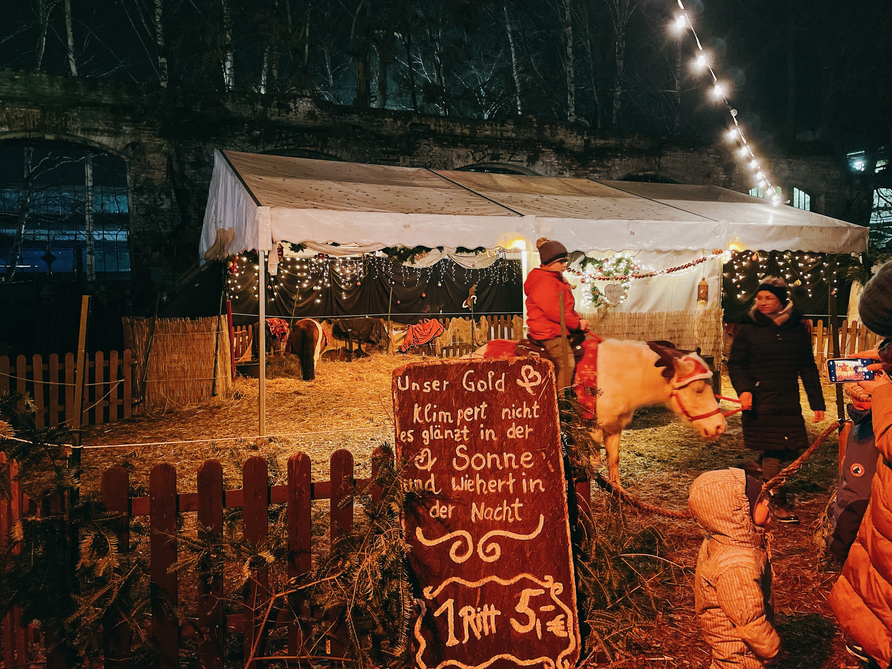 比起台灣夜市小朋友搭的小火車,可以騎真正的馬繞圈圈根本太夢幻!後方馬廄裡還有很多匹蓋著保暖毛毯的迷你馬,隨時隨地可支援前線,柏林小朋友的聖誕月真的好幸福。