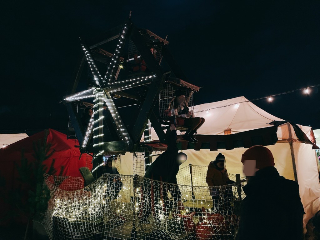 【Historischer Weihnachtsmarkt中古聖誕市集】取暖用的木柴散發特有的火烤香氣瀰漫周遭,市集走道以木屑鋪設更顯古樸,攤販精心打扮化身中世紀刻板印象中「那種會出現在城堡/城鎮裡」的古代人;但最吸睛的當然是「人力驅動」的中古遊樂設施啦!
