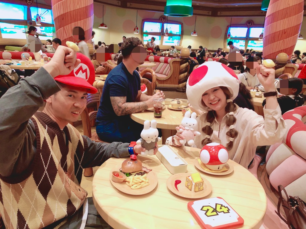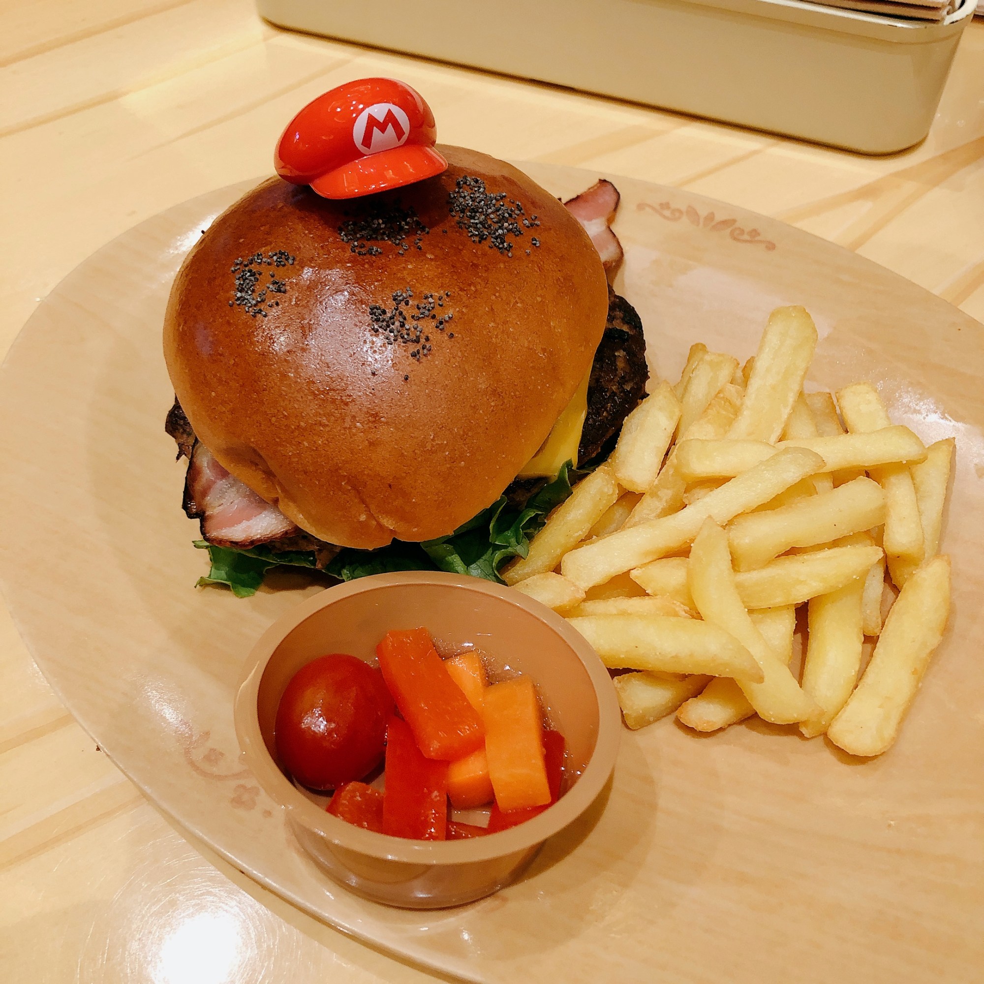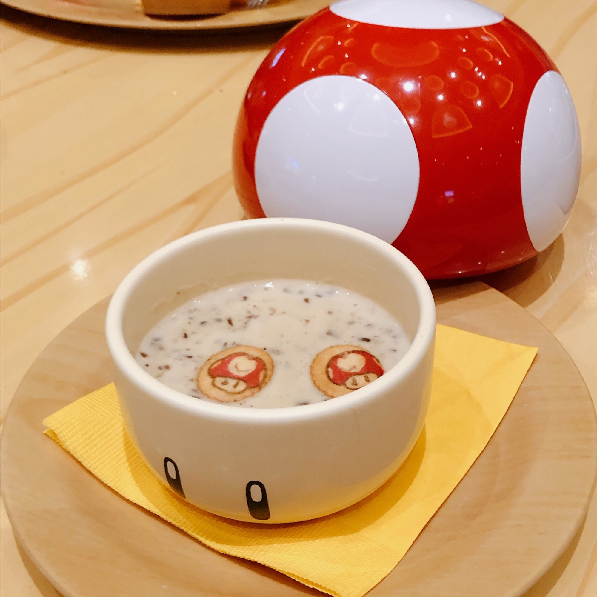 漢堡和蘑菇濃湯真的非常好吃。漢堡上的瑪利歐帽子叉可以帶回家做紀念,但蘑菇濃湯的紅色蕈帽湯碗上蓋是餐具一部分、不可以拿走。