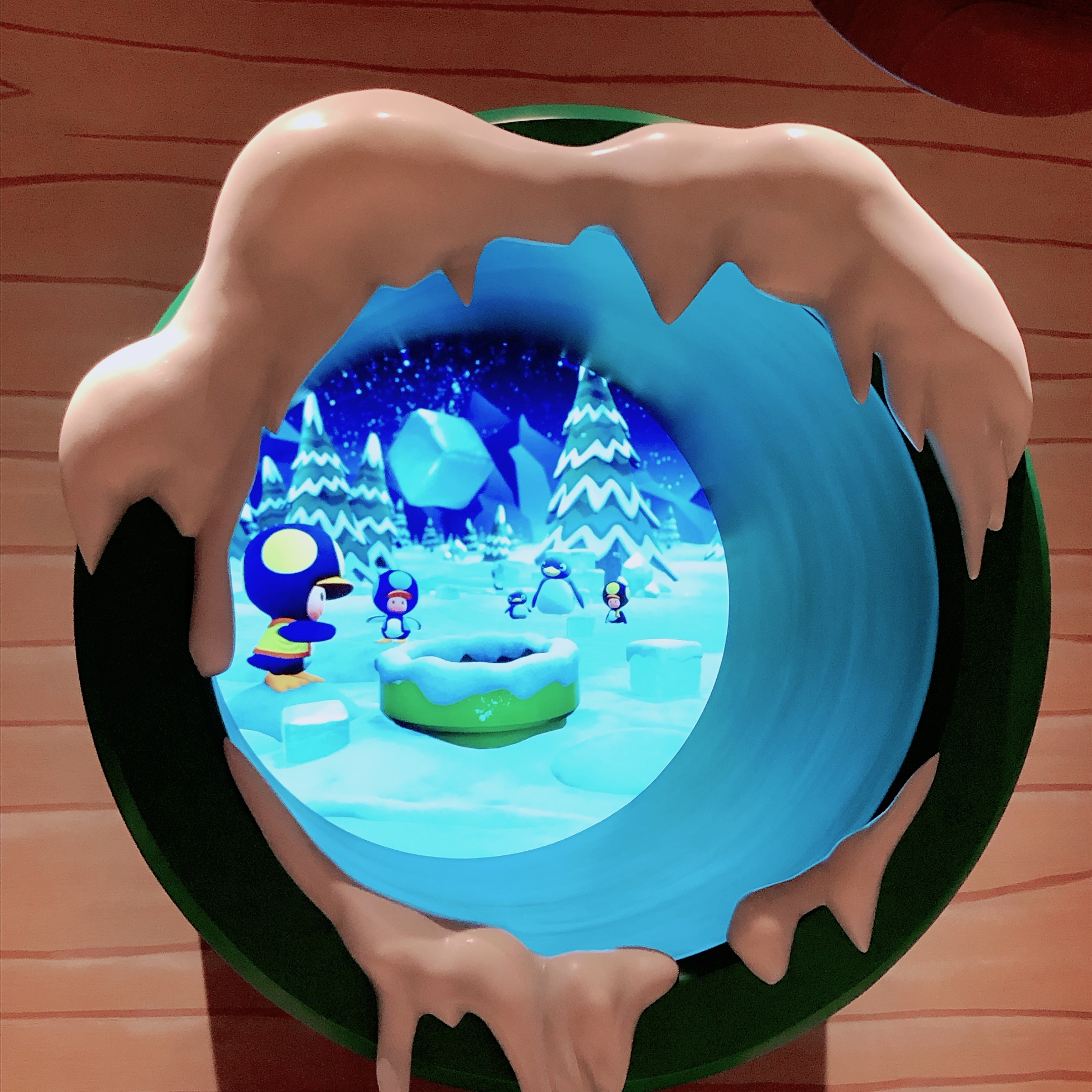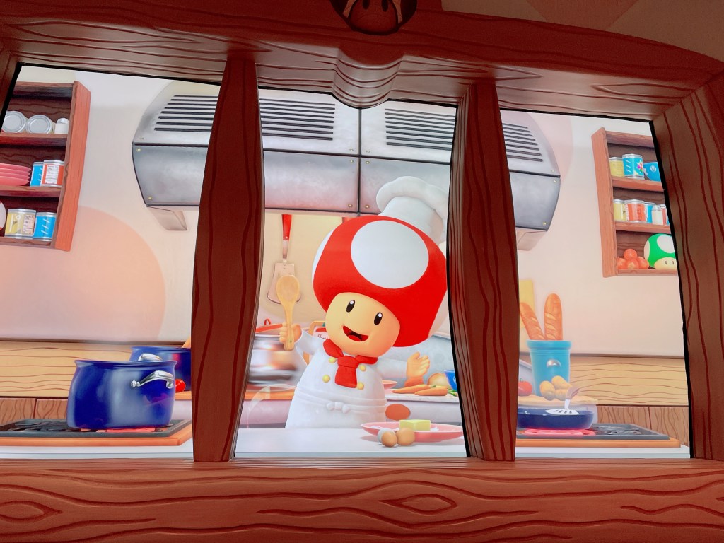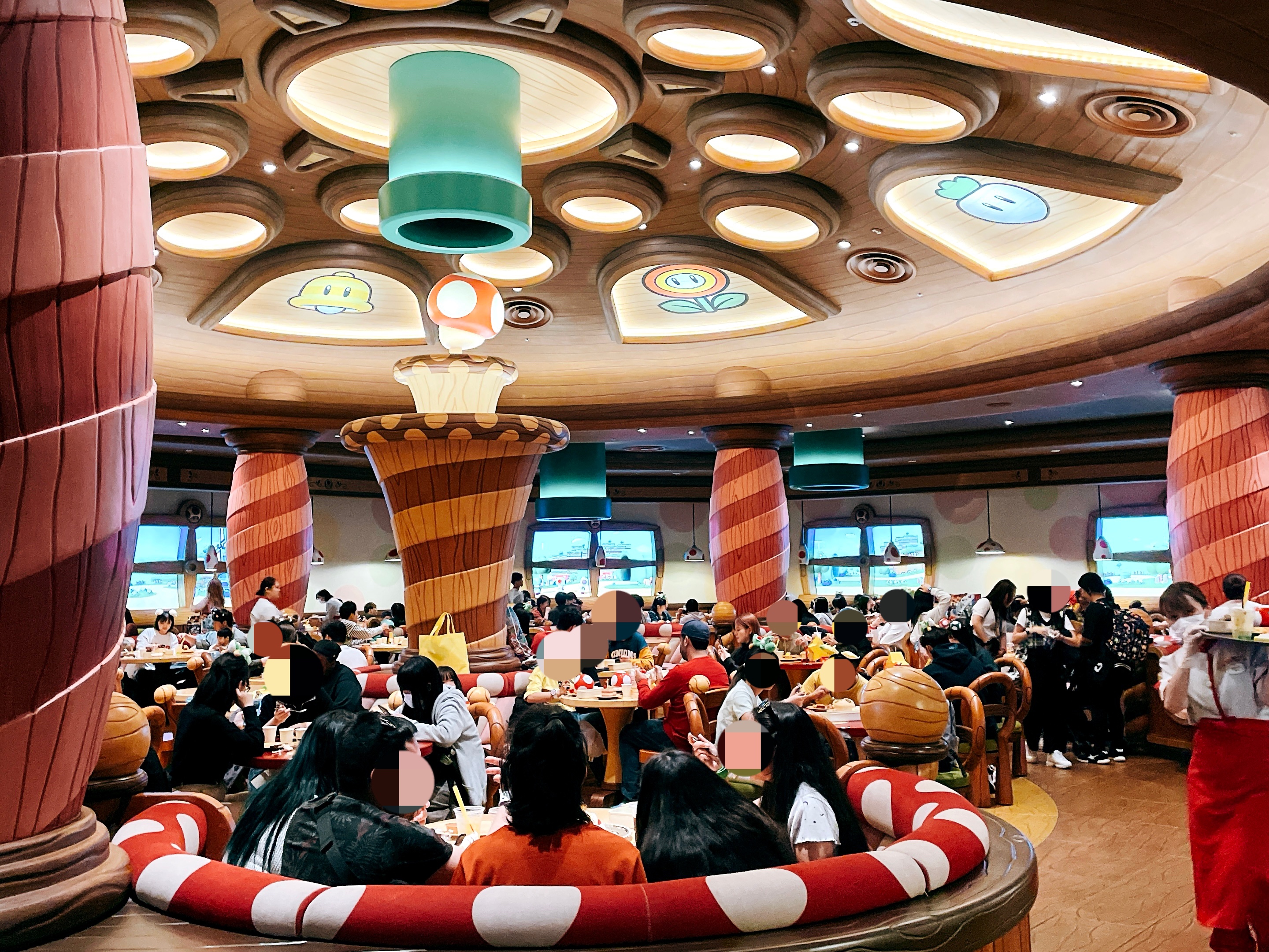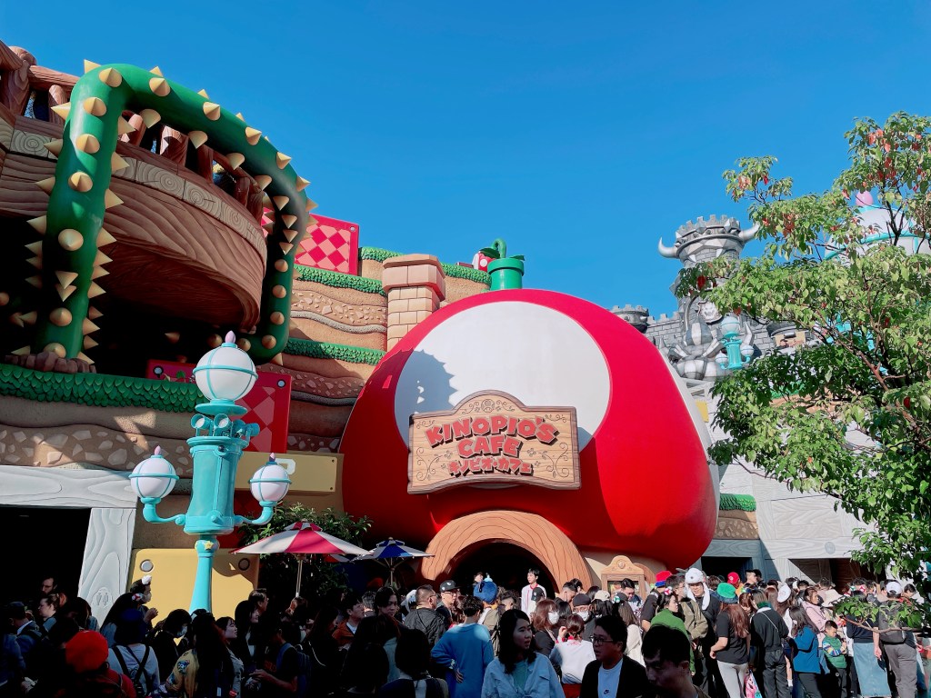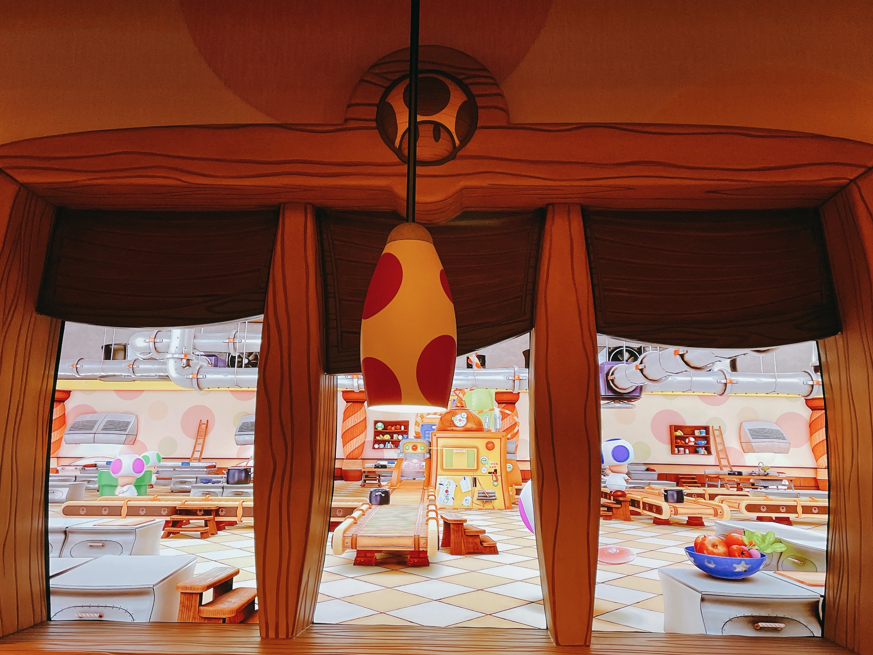 咖啡店真的超級可愛。天花板、燈具、座位都充滿蘑菇主題小巧思,甚至窗戶玻璃也播著奇諾比奧們在廚房忙進忙出的可愛動畫,是超級任天堂世界裡我最喜歡的愜意角落。