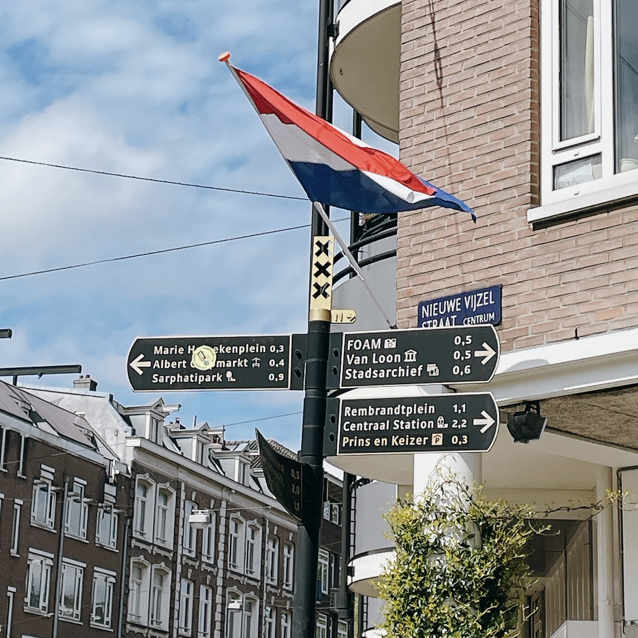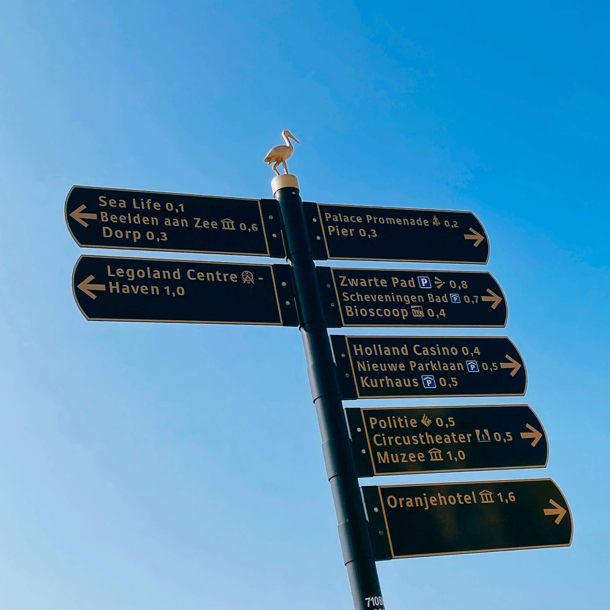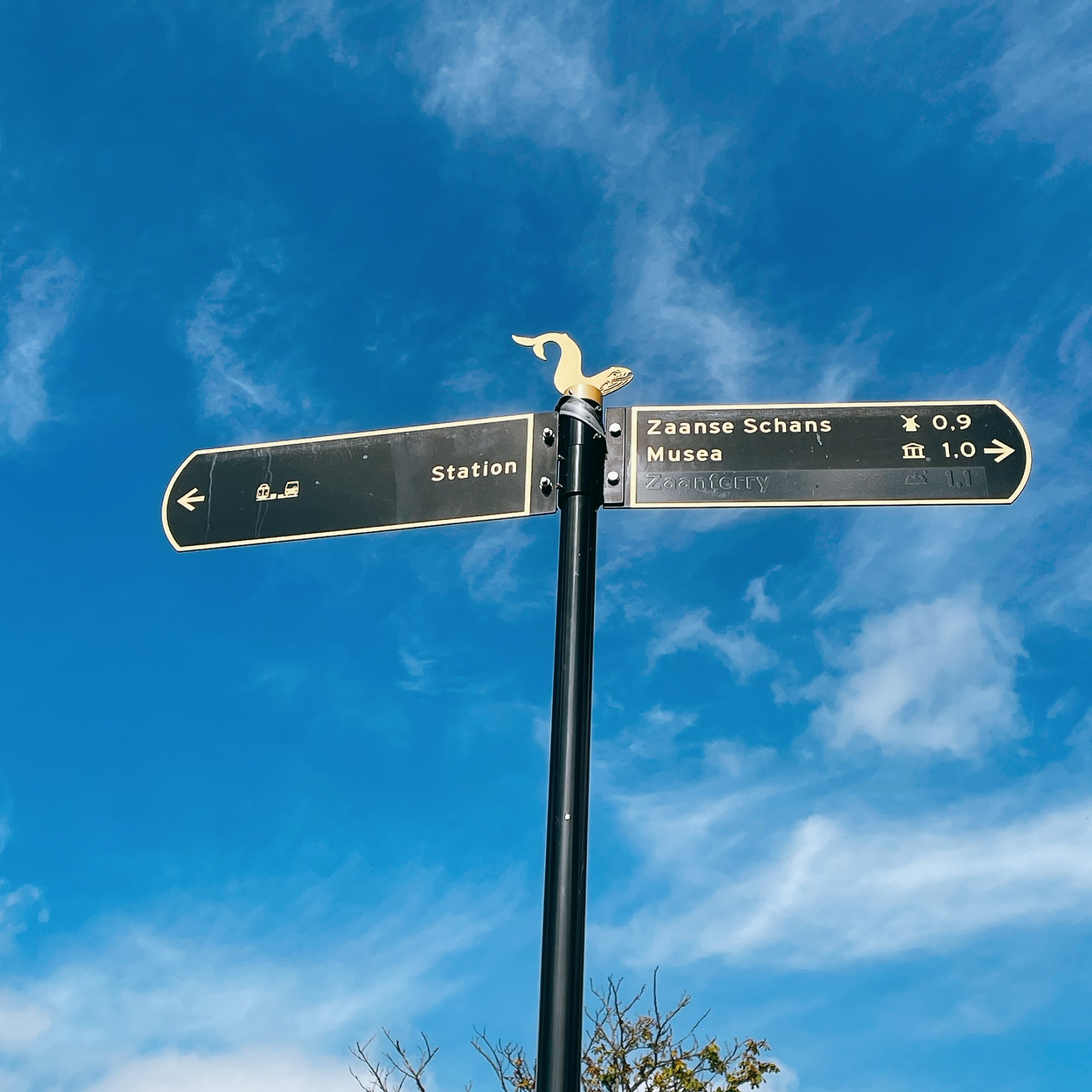 如果仔細觀察荷蘭城鎮上的路牌,無論阿姆斯特丹/海牙/贊丹/台夫特還是最南邊的馬斯垂克,都是統一規格「深底色尬燙金文字,上面再加上金色的城市立體logo」,海牙是送子鳥、阿姆是「xxx」、贊丹是大鯨魚…