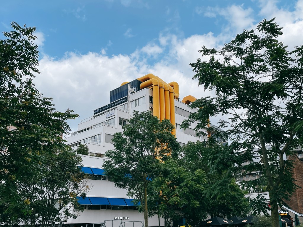 同一個街區看到這棟黃色水管外露的建築是鹿特丹中央圖書館(Bibliotheek Rotterdam)。這個圖書館就是標準的「住著老靈魂的年輕肉體」。鹿特丹中央圖書館17世紀就存在了,但1980年代才入駐這棟彷彿「堆疊知識般」的現代建築裡。