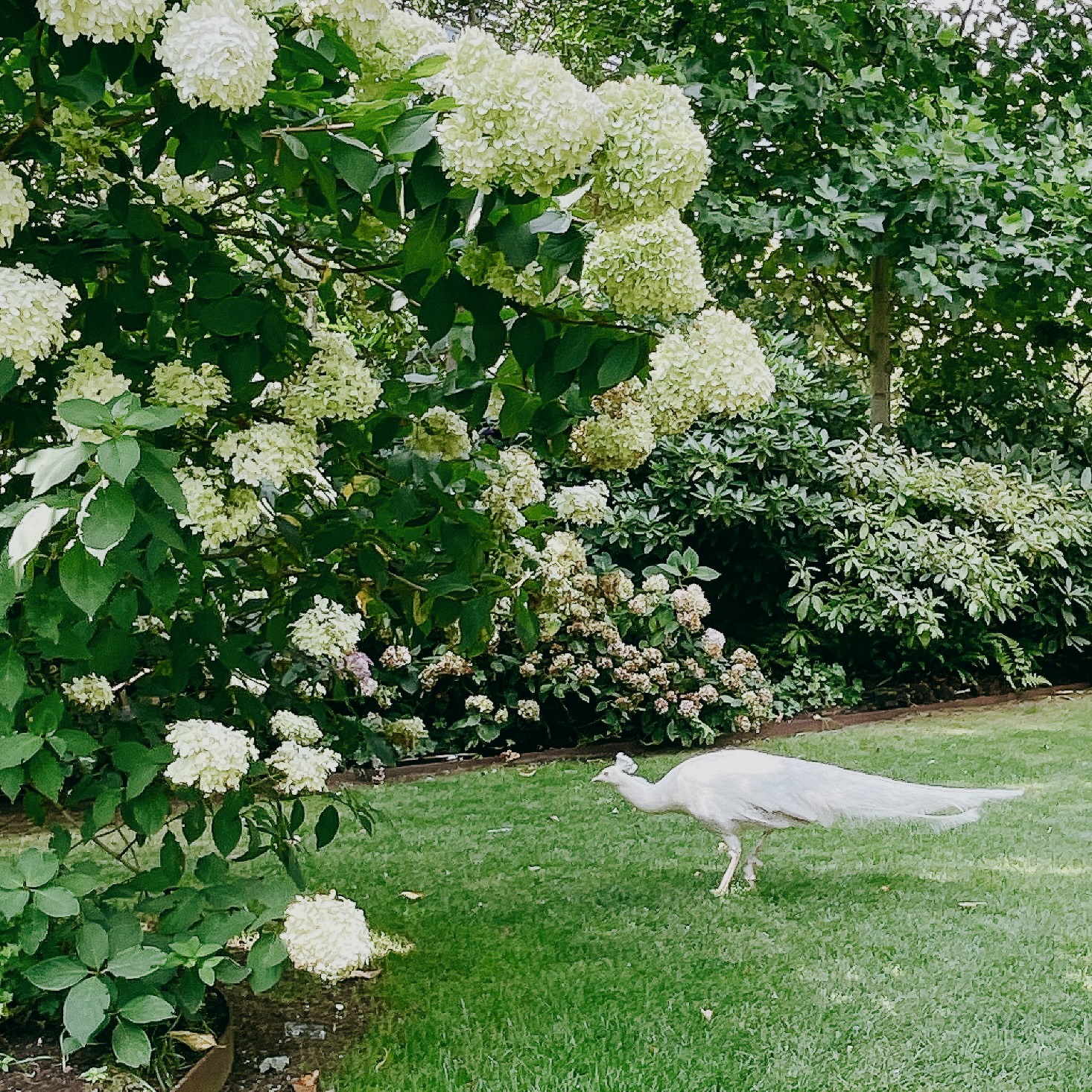 一開始我只是想找個樹陰下的座位喝咖啡吃三明治,結果忽然間從天而降一隻真正的白色孔雀、下一秒孔雀舞台也隨音樂『開屏』,原來今天有室外免費芭蕾表演!