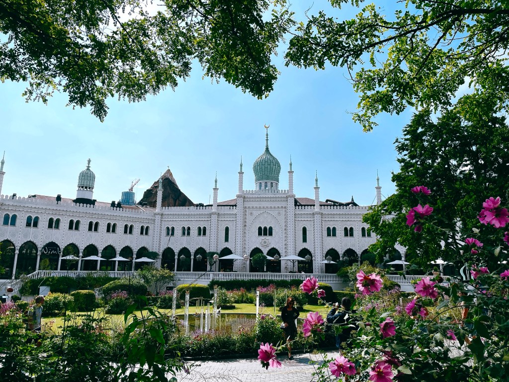 白色閃耀的阿拉伯宮殿裡面是法式餐館,宮殿外則是充滿異國情調的水池庭園造景。樹上和草地也能發現孔雀自由自在於Tivoli花園裡散步,十足體現過去丹麥人對於「神秘東方」既有的刻板印象。