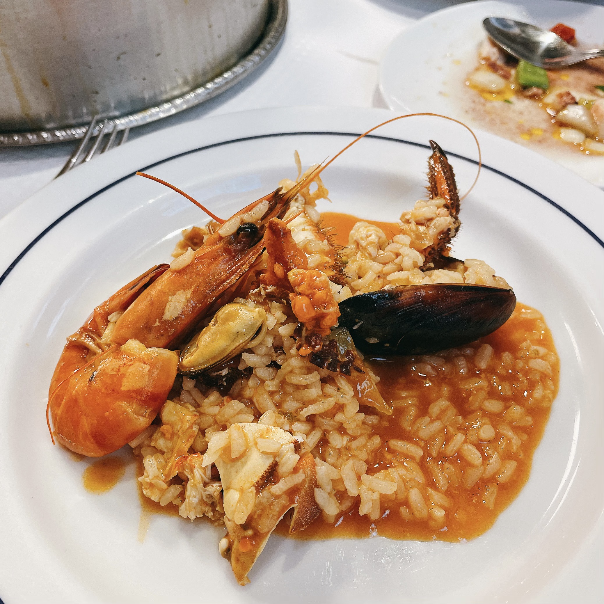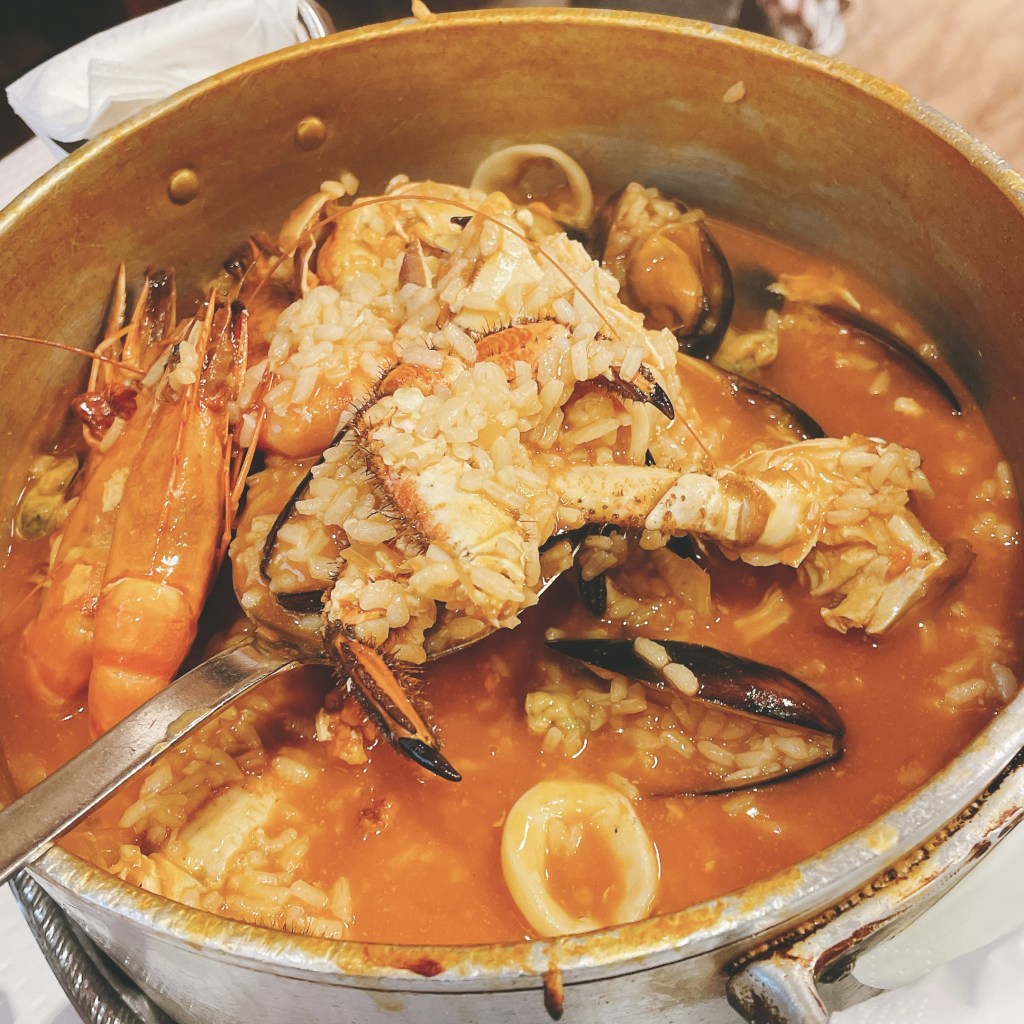 新鮮大蝦、螃蟹、蛤蠣、淡菜、透抽、魚肉片,光聞就讓人口水直流。葡萄牙的海鮮飯是一整只大鐵鍋直上餐桌,一開始像是「湯泡飯」、慢慢地鍋內餘熱會讓湯汁逐漸收乾,吃起來口感神似燉飯。