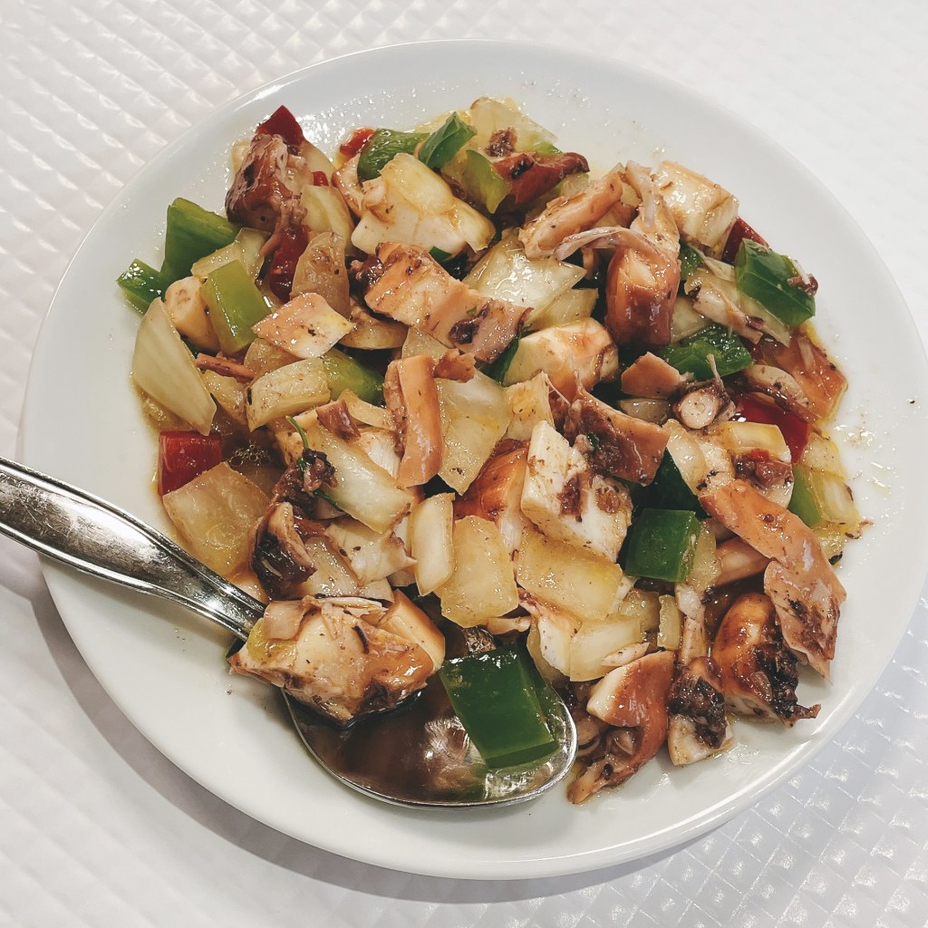 雖然走進【Marisqueira Uma】時店員說「我們只有賣海鮮飯,這樣可以嗎?」但其實菜單上還是有幾個簡單的開胃前菜。他們家的章魚沙拉中規中矩,以洋蔥和青椒搭配,吃起來蠻清爽的。