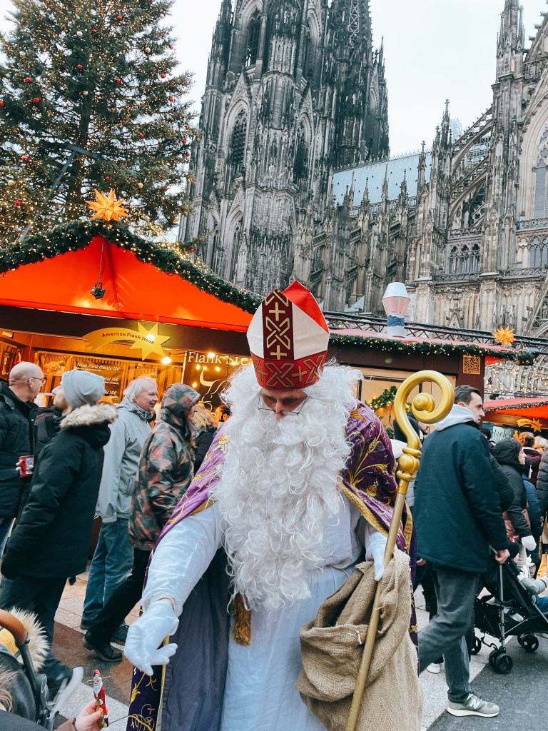 我們是在聖尼古拉斯日(12月6日)來逛聖誕市集,所以當天下午的活動當然就是「尼古拉斯發糖果」。通常尼古拉斯會主動靠近小朋友和他們說話、送糖果禮物;但可能科隆外國遊客太多(這次遇到好多美國人)而且又在大教堂旁,尼古拉斯發糖果前都得突破蜂擁而上要求合照的觀光客…
