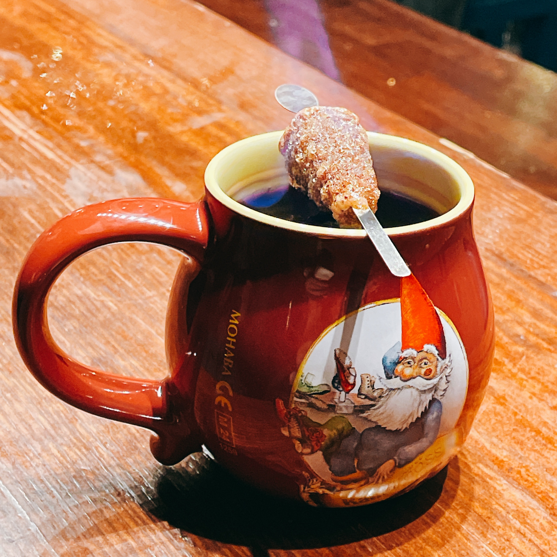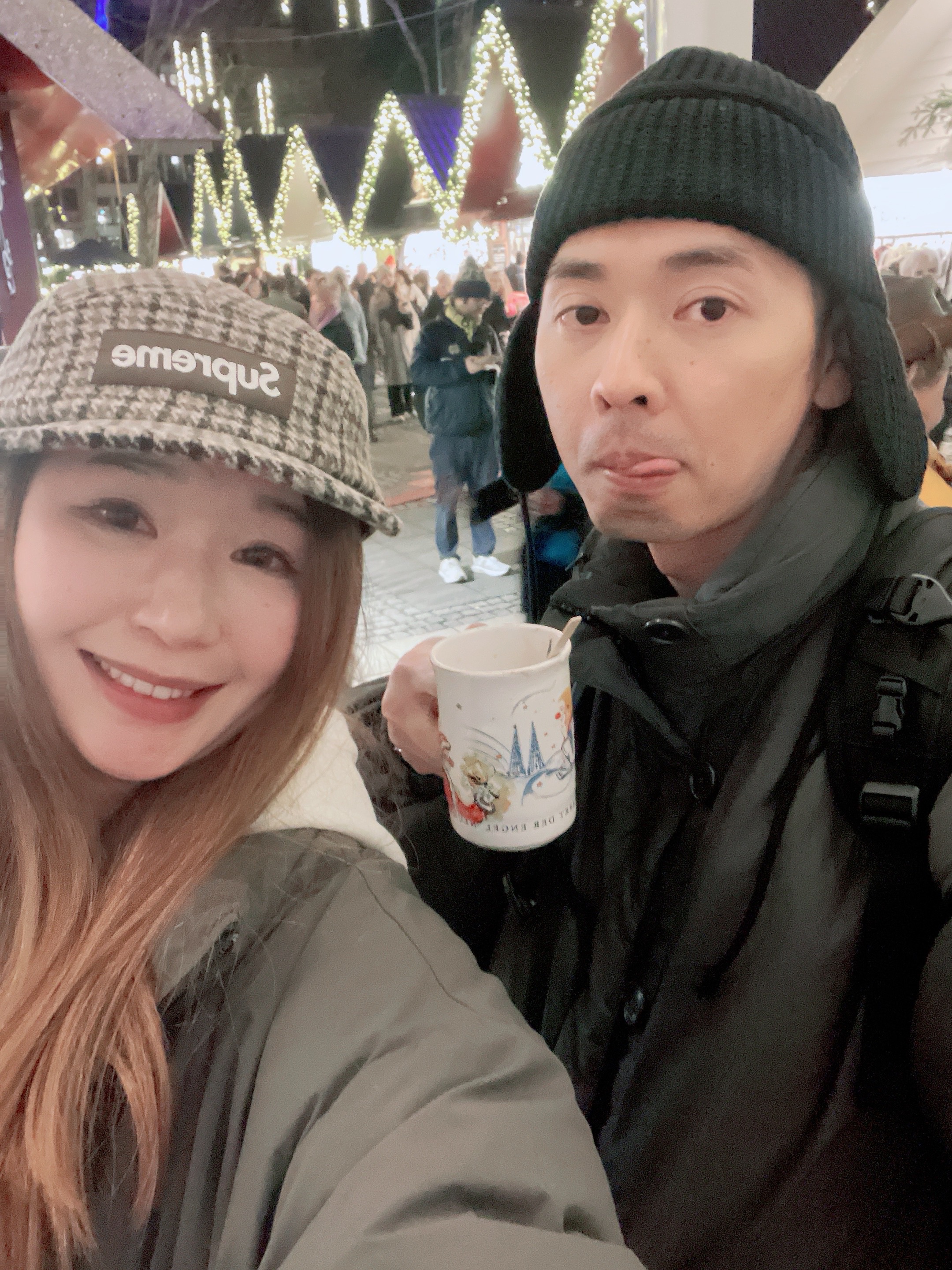 由於稍早在另一個市集喝的烈火熱紅酒,所以我們點了暖呼呼的鮮奶油熱可可(€8,不含押金)。今年的熱紅酒杯收藏就決定是你了!