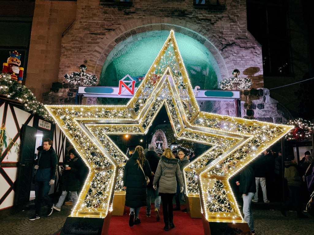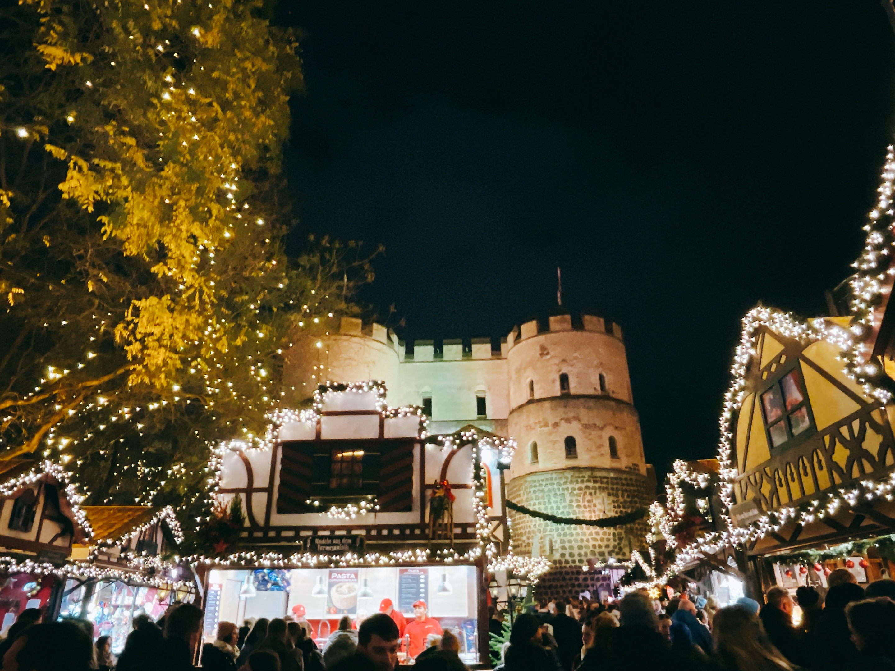 尼古拉斯聖誕村市集(Nikolausdorf)就在天使市集附近,走路約10分鐘可到,可以安排一起逛。位於歷史建築Hahnentor城堡遺跡城牆前的廣場,有種中古世紀的純樸浪漫。