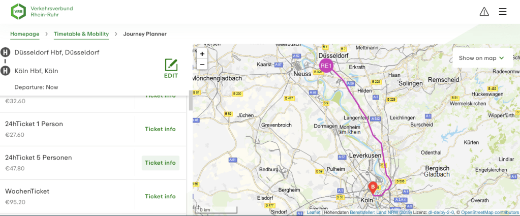 這種日票是以驗證打票(validat)時間開始計算24小時,可以搭杜塞道夫和科隆市內的地鐵/公車/U bahn/ S bahn/ RE區間火車,簡單來說就是除了德國高鐵ICE不能搭之外,其他都可以。