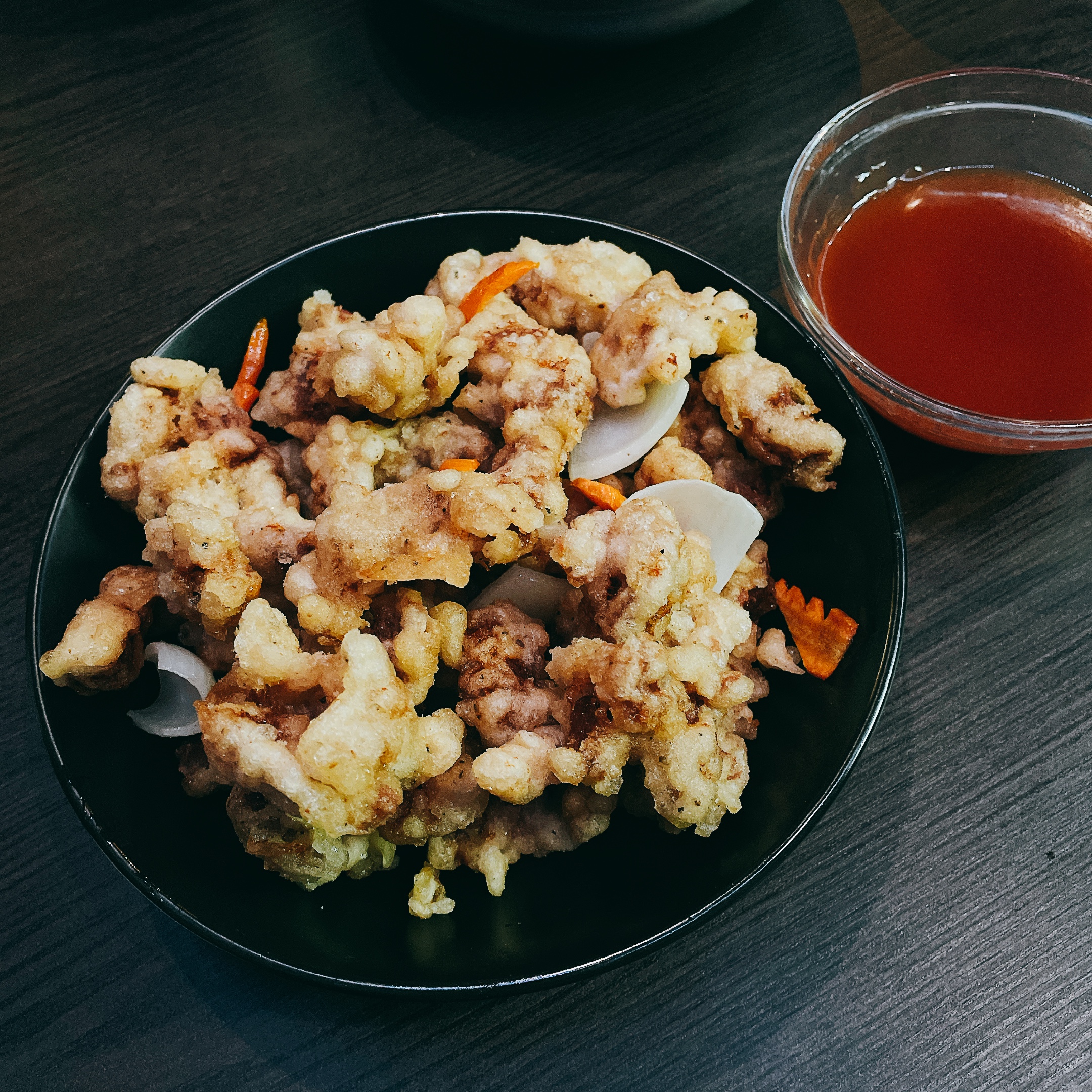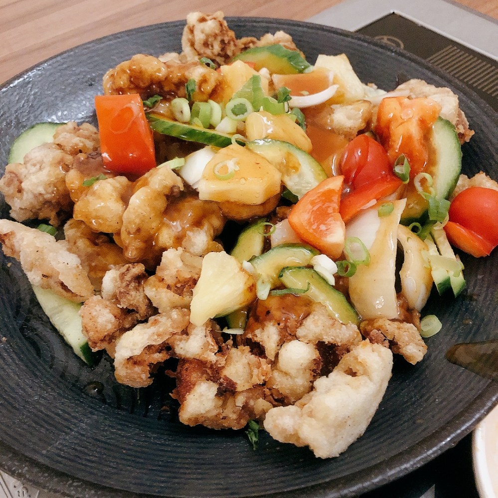 外酥內嫩的韓國中式炸肉,酸甜勾芡醬汁另外用小缽裝,可依客人喜好沾著吃;而且這樣吃到最後的每一口炸肉的麵衣都十分酥脆,是我們喜歡的擺盤方式。