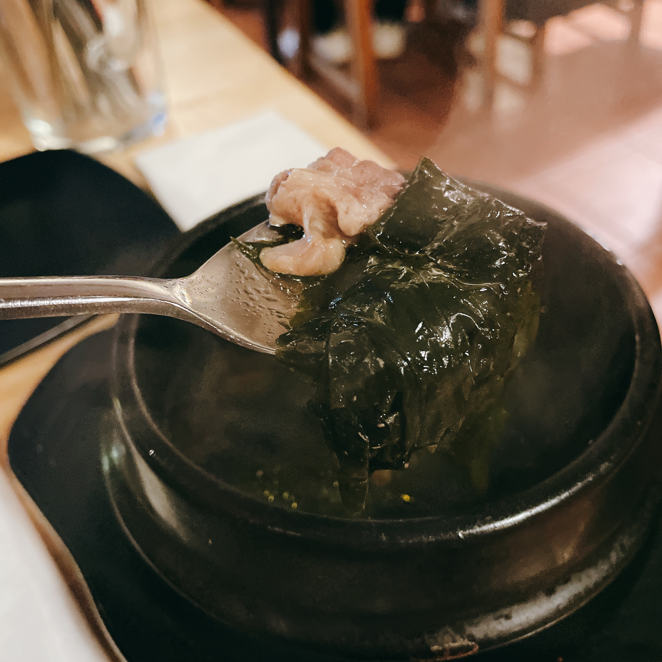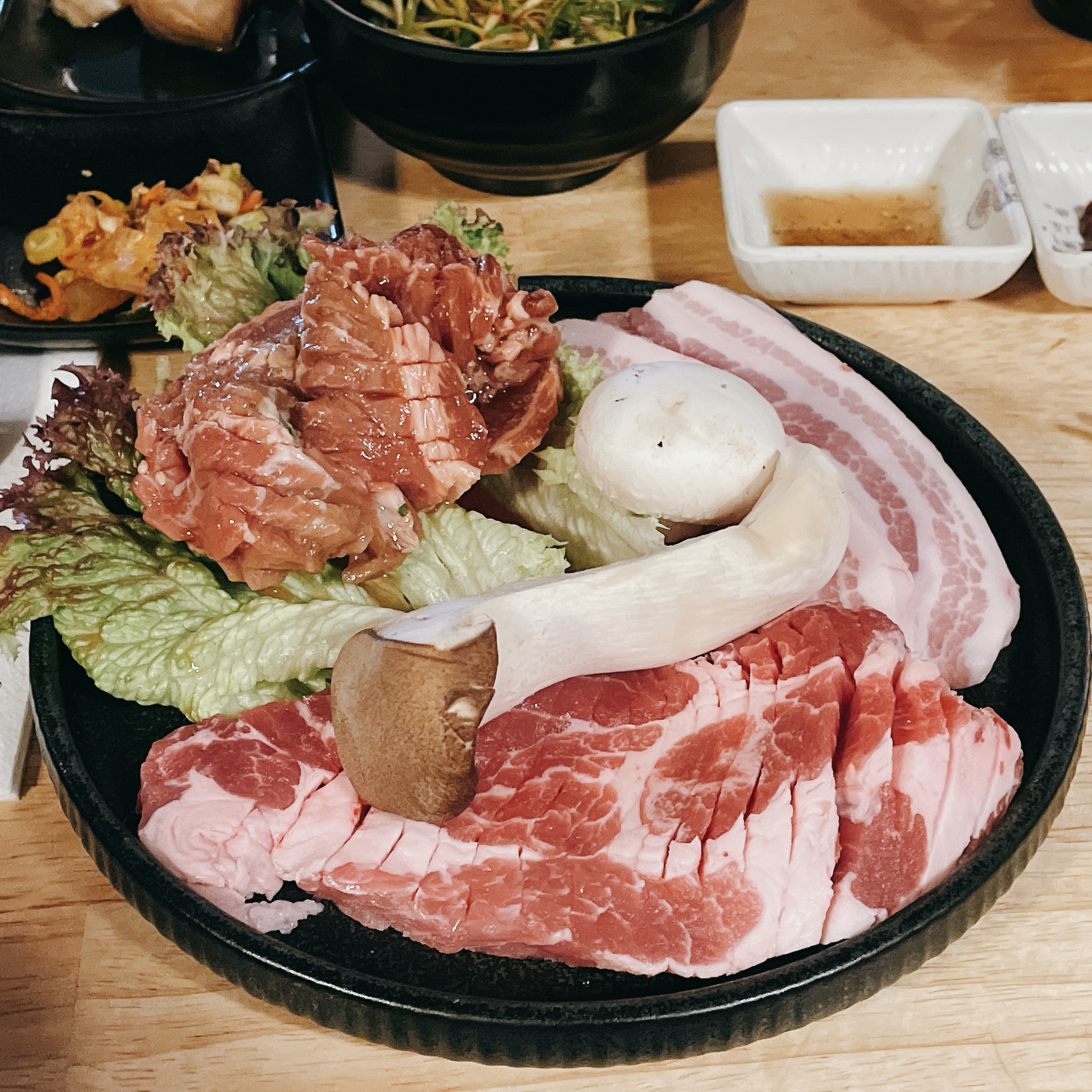 我最喜歡的是豬肉拼盤套餐,內容有:豬五花100g、豬頸肉100g、洋釀豬頸肉100g和一盅誠意滿滿的牛肉海帶湯,這樣一份才€32。
