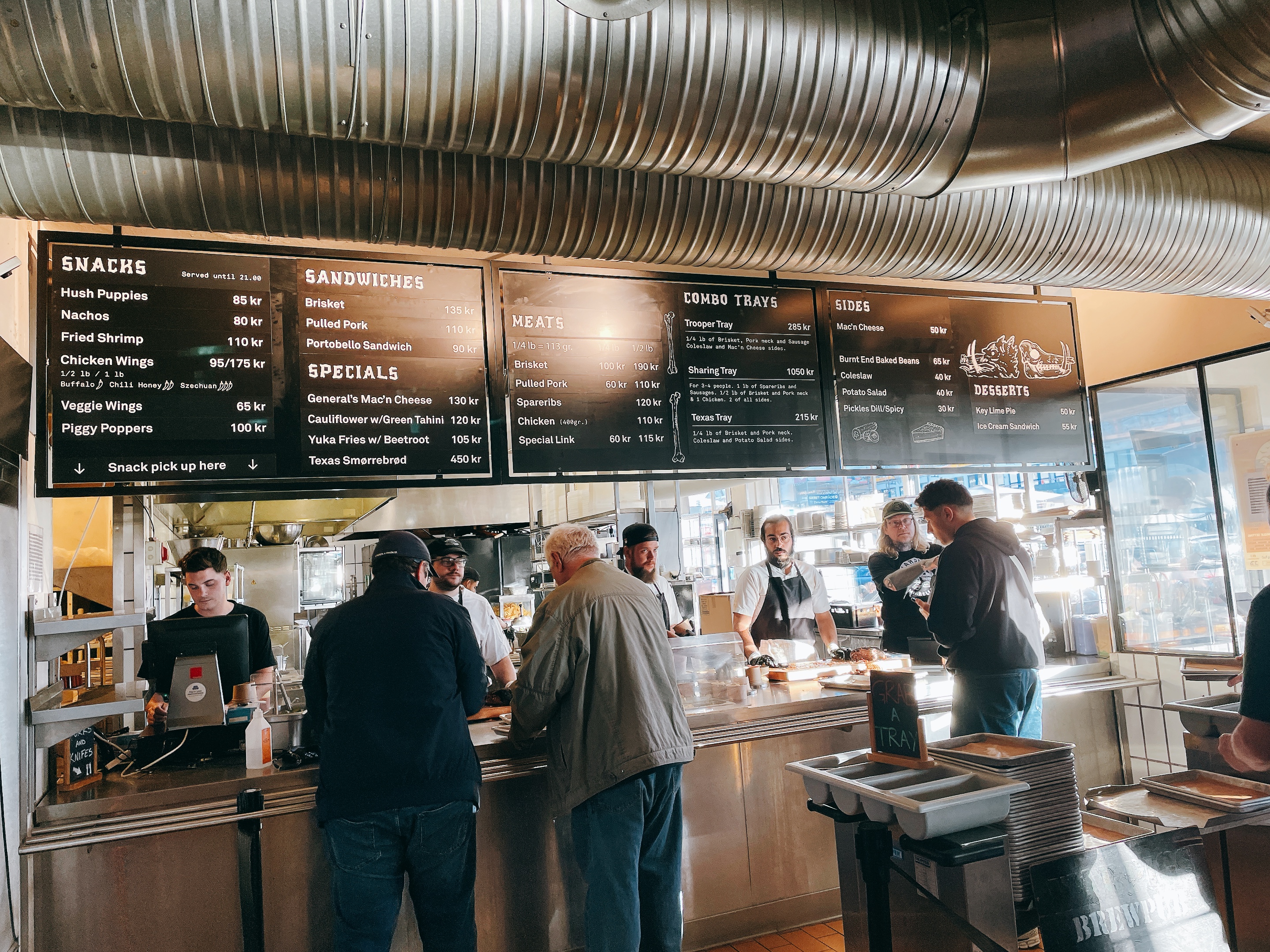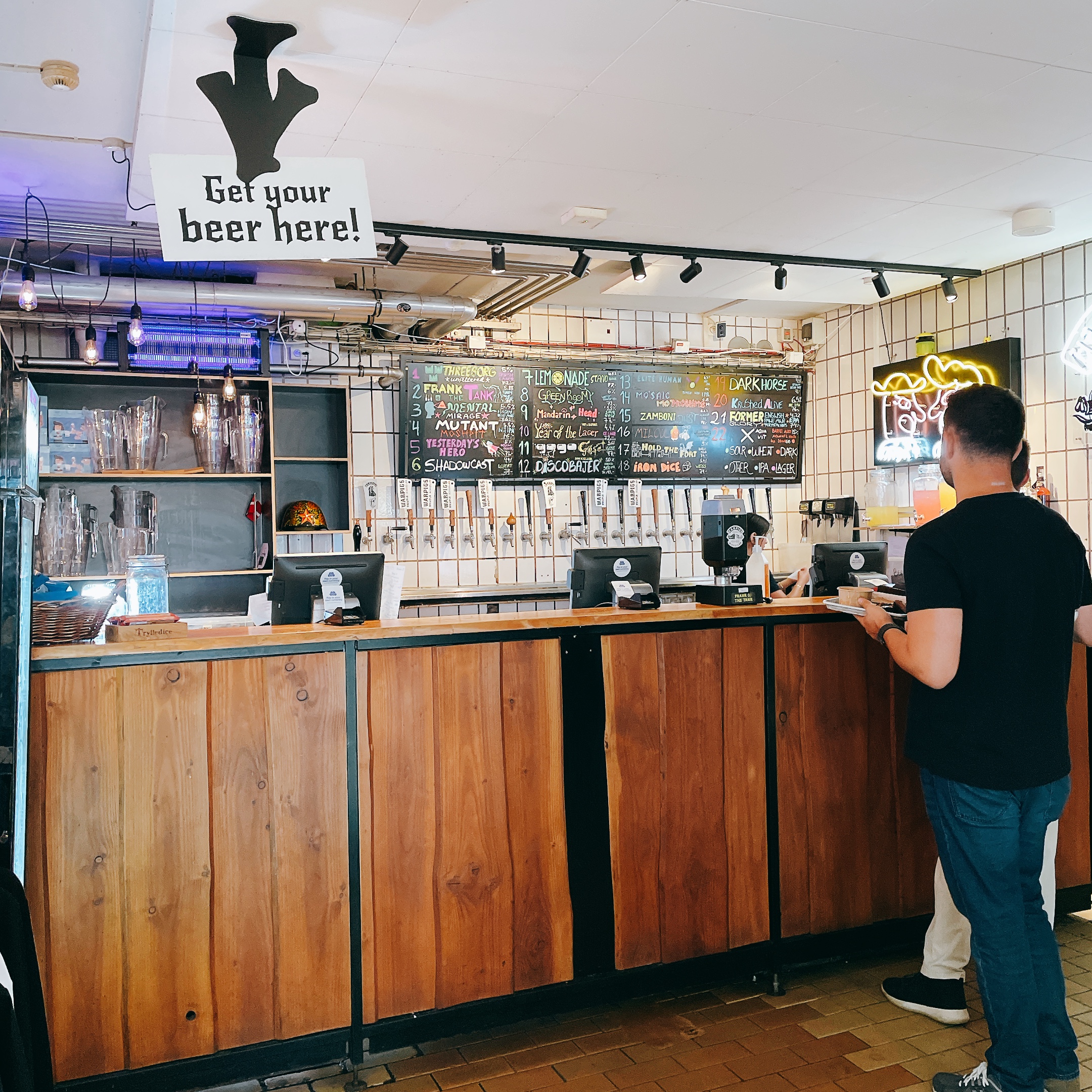 如果沒有事先訂位,只要直接走進店內(或在戶外)自己找位置即可。餐點櫃檯和啤酒櫃檯是分開,如果排隊人潮太多、可以先點一杯啤酒邊喝邊排非常快樂!