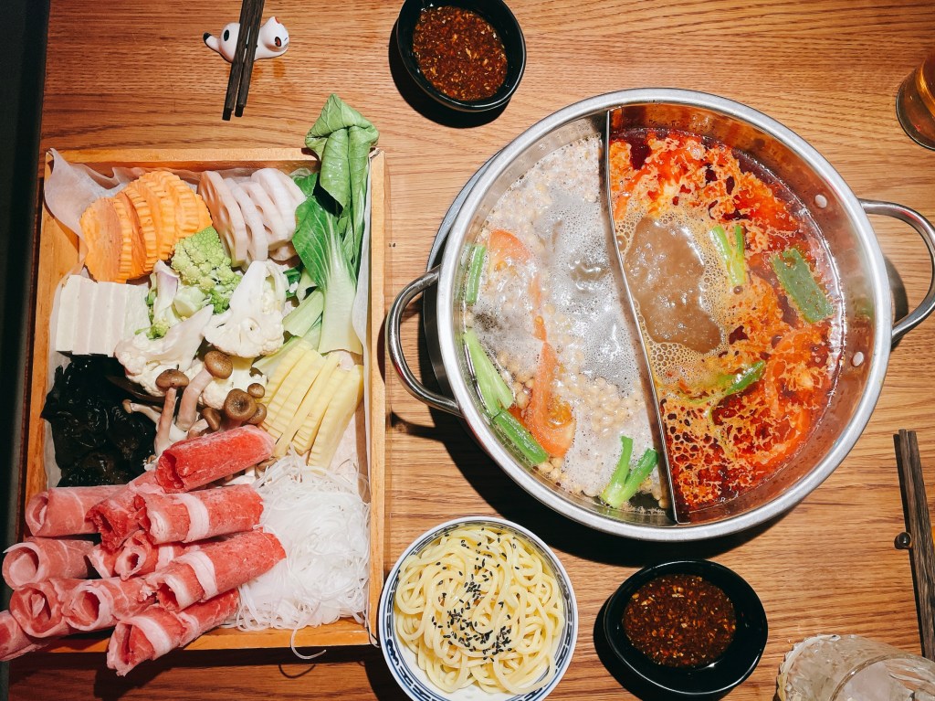 點餐是以人頭計價的定量套餐(295 DKK/大人)。湯底共有清湯、酸辣椒、麻辣鍋、泡菜鍋四種可選擇,套餐可選擇兩種湯底作為鴛鴦鍋,蔬菜和肉片的份量讓人吃得輕巧不會過飽。