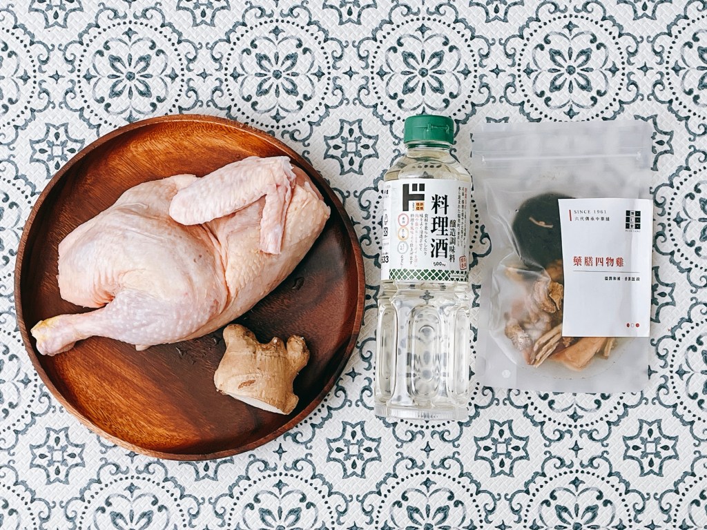 帶骨雞肉(半隻不切)、薑(10g)、四物藥材(1包)加水(1000ml)煮滾後調整為小火,蓋上鍋蓋燉30分鐘。