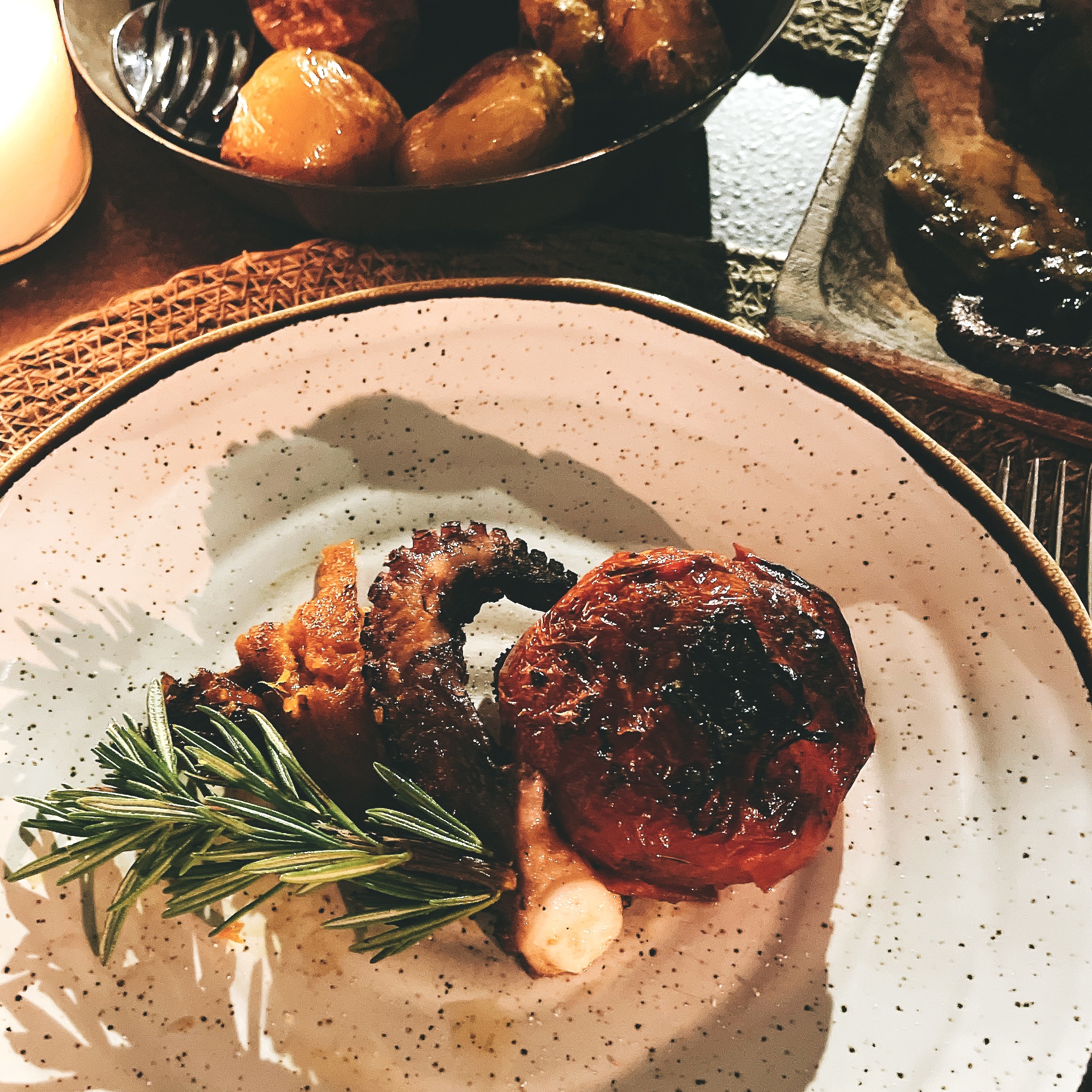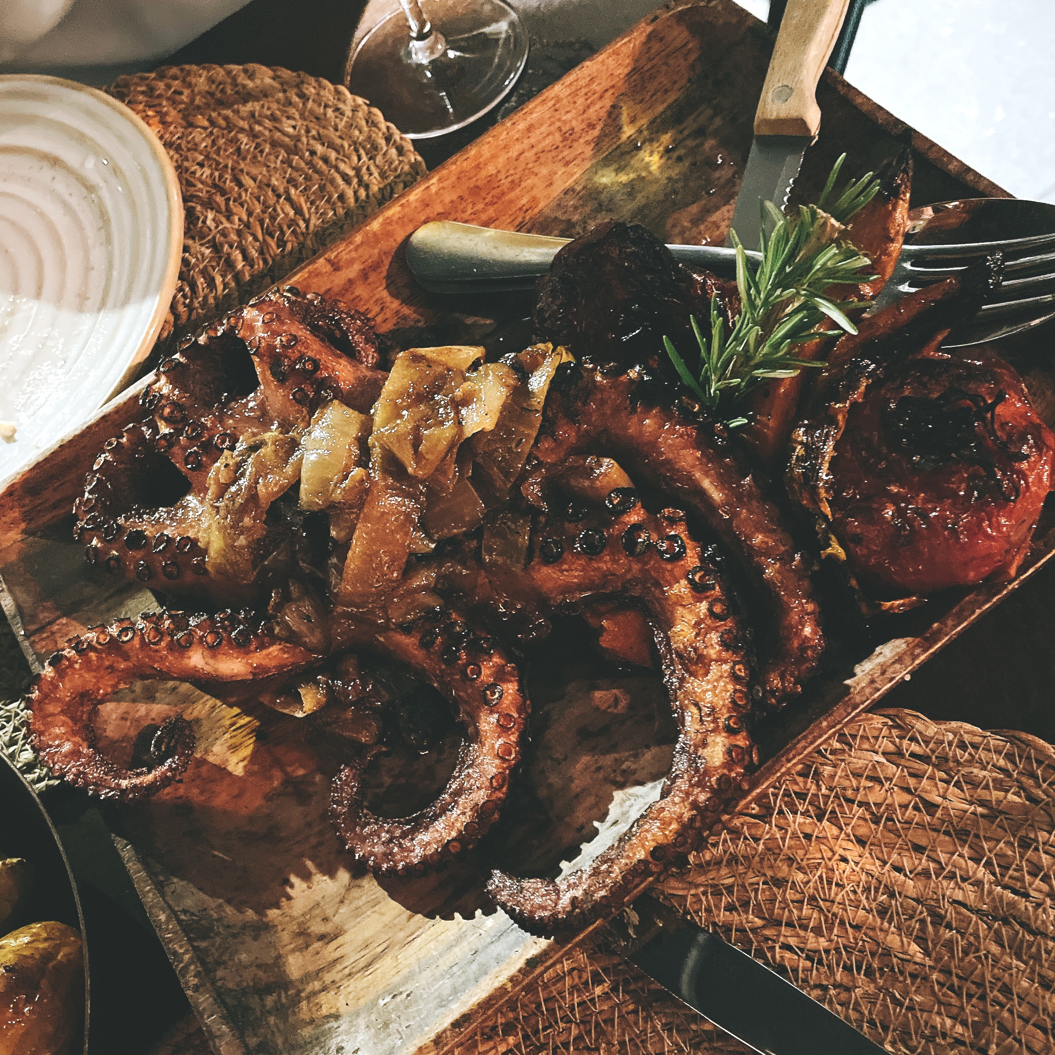 炭烤章魚佐番茄 €42,00 ,額外加配菜烤馬鈴薯€3,50