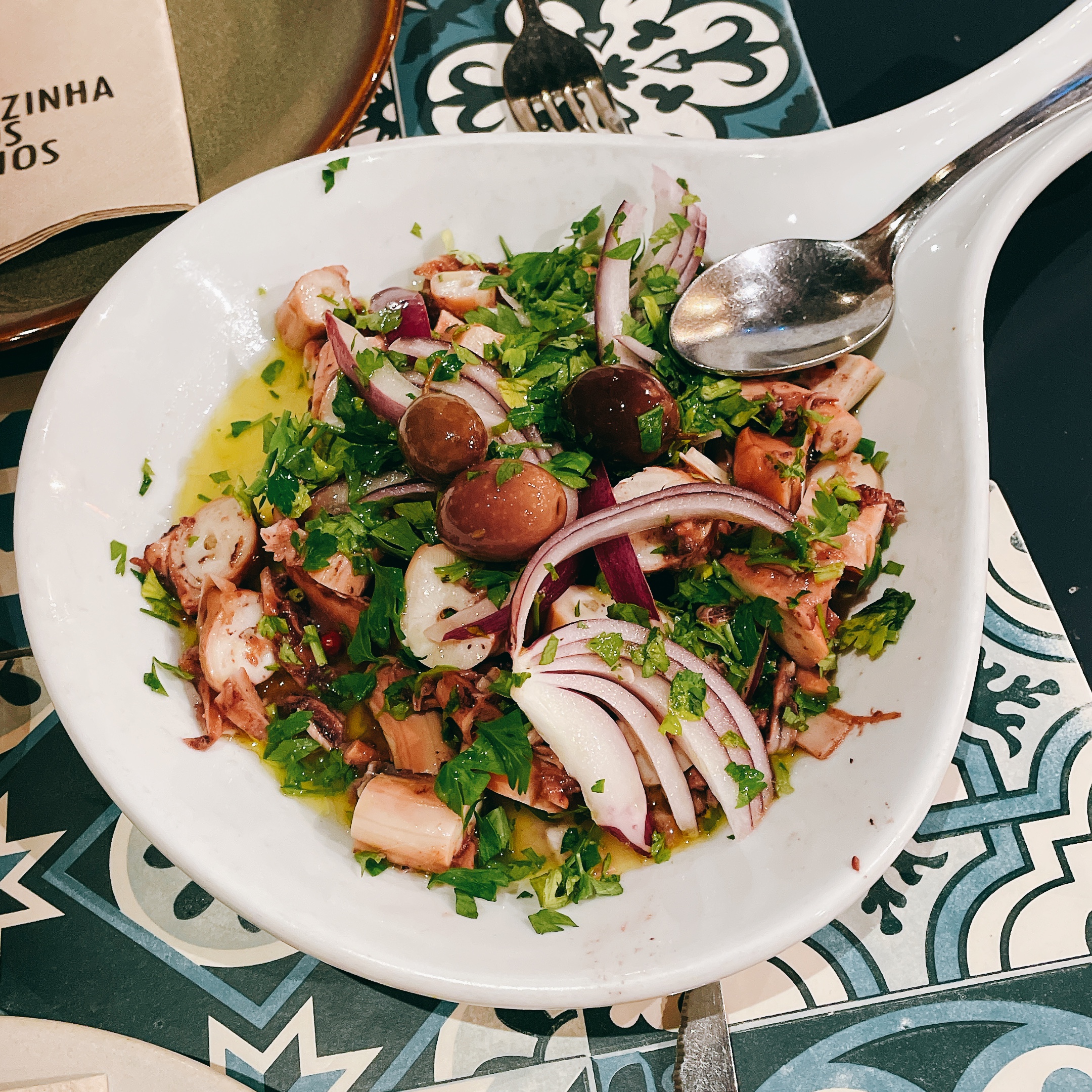 熟章魚混合初榨橄欖油、淺漬橄欖、新鮮巴西里,紫洋蔥絲帶來微嗆的刺激,是這次在葡萄牙吃那麼多章魚沙拉,最有特色、不是直接從章魚罐頭打開盛盤的那種!
