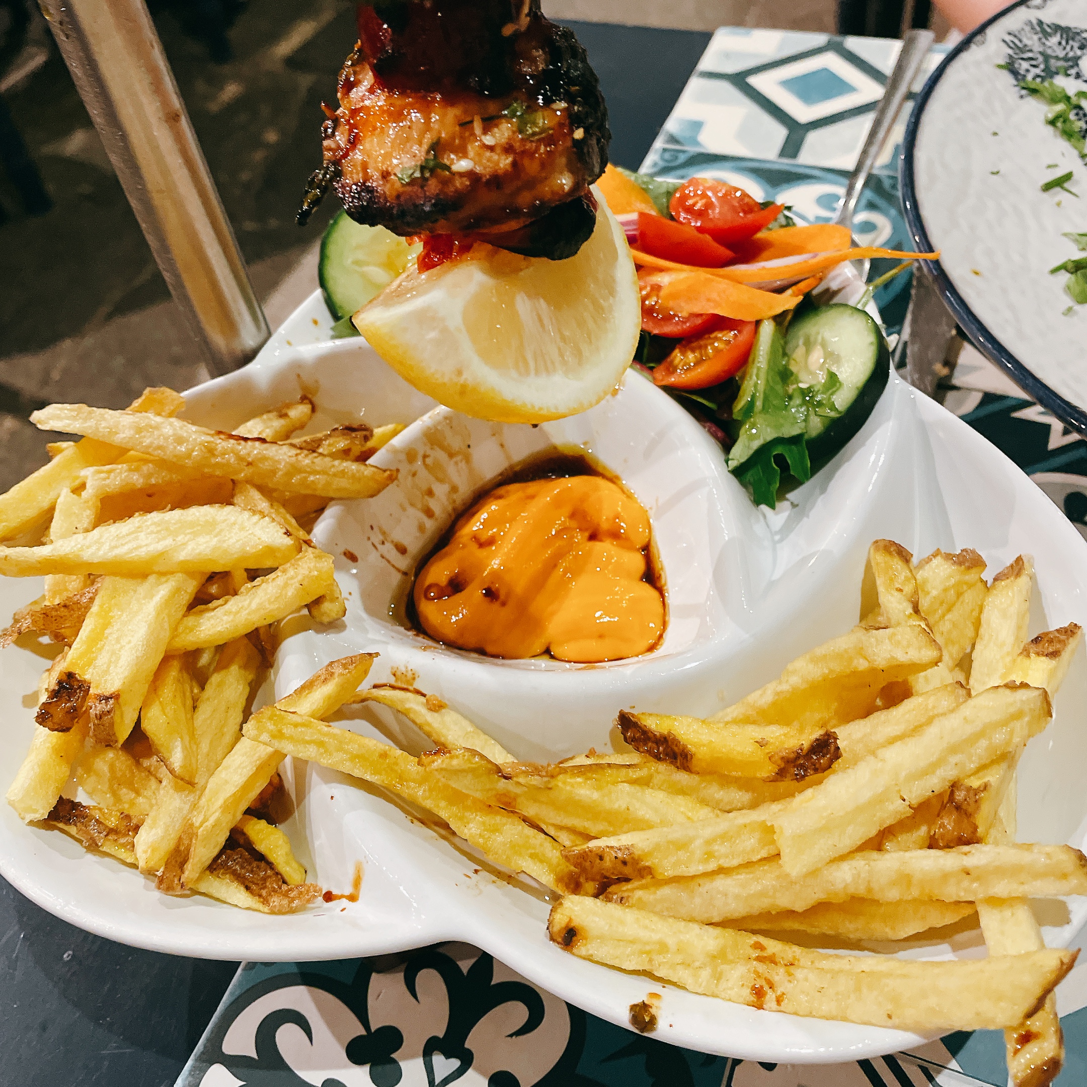 不過我必須老實說一句:「葡萄牙人真的很不會炸薯條」不管在波多還是里斯本,薯條都一副慘白樣,明明剛炸好但吃起來軟軟的、完全不及格!總之,隨雞肉烤串附贈的薯條,真的不吃也罷;吃點大黃瓜、番茄和幾片芝麻葉解膩即可。