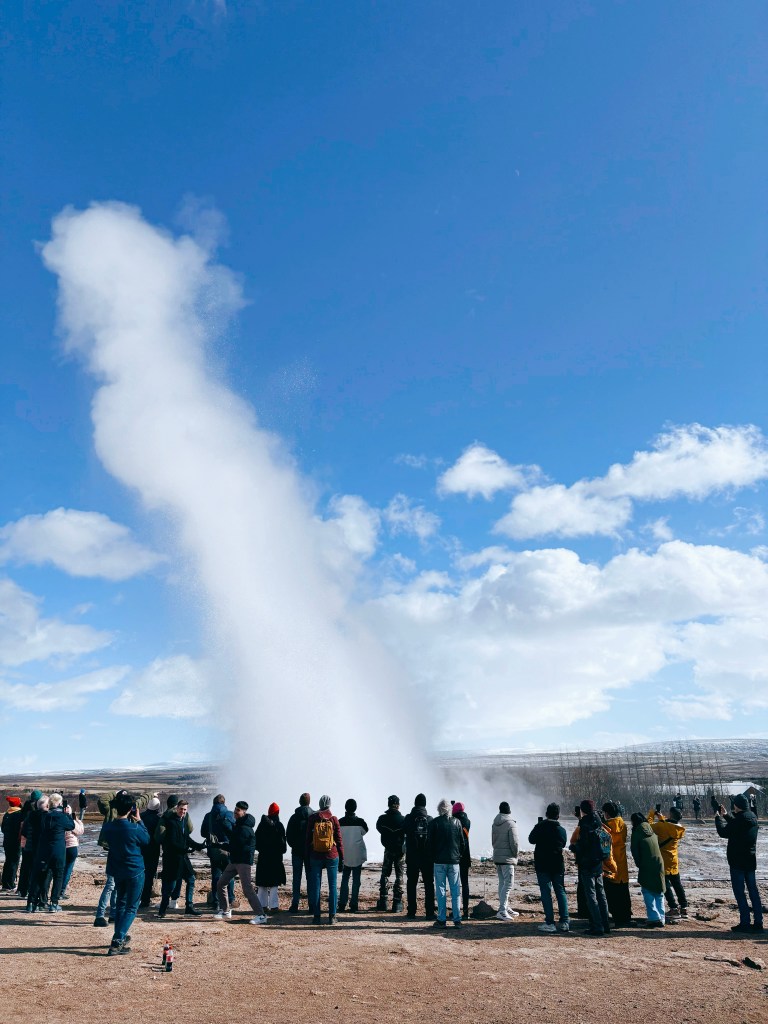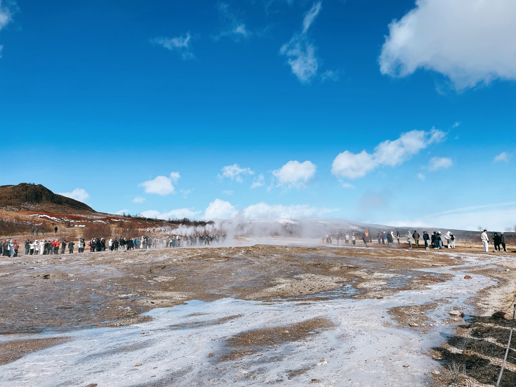 跟著人潮前進,馬上就能看到群眾圍繞著Strokkur間歇泉、在寒風中等待噴泉。