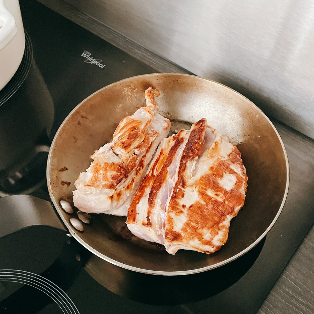 De Buyer鐵鍋加熱到物理性不沾鍋的溫度(噴水後會變成水珠在鍋裡滾動),整塊厚切豬五花(500g)先煎帶皮那面,等上色後再翻面煎,備用。