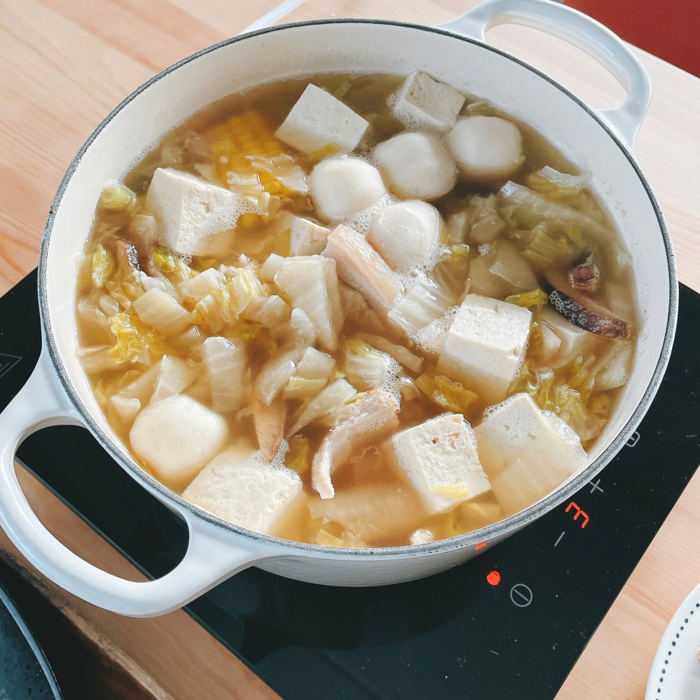 連同袋中的酸白菜湯汁、五花肉片、凍豆腐、玉米、菇類等…火鍋料加入鍋裡煮滾至食材熟透,