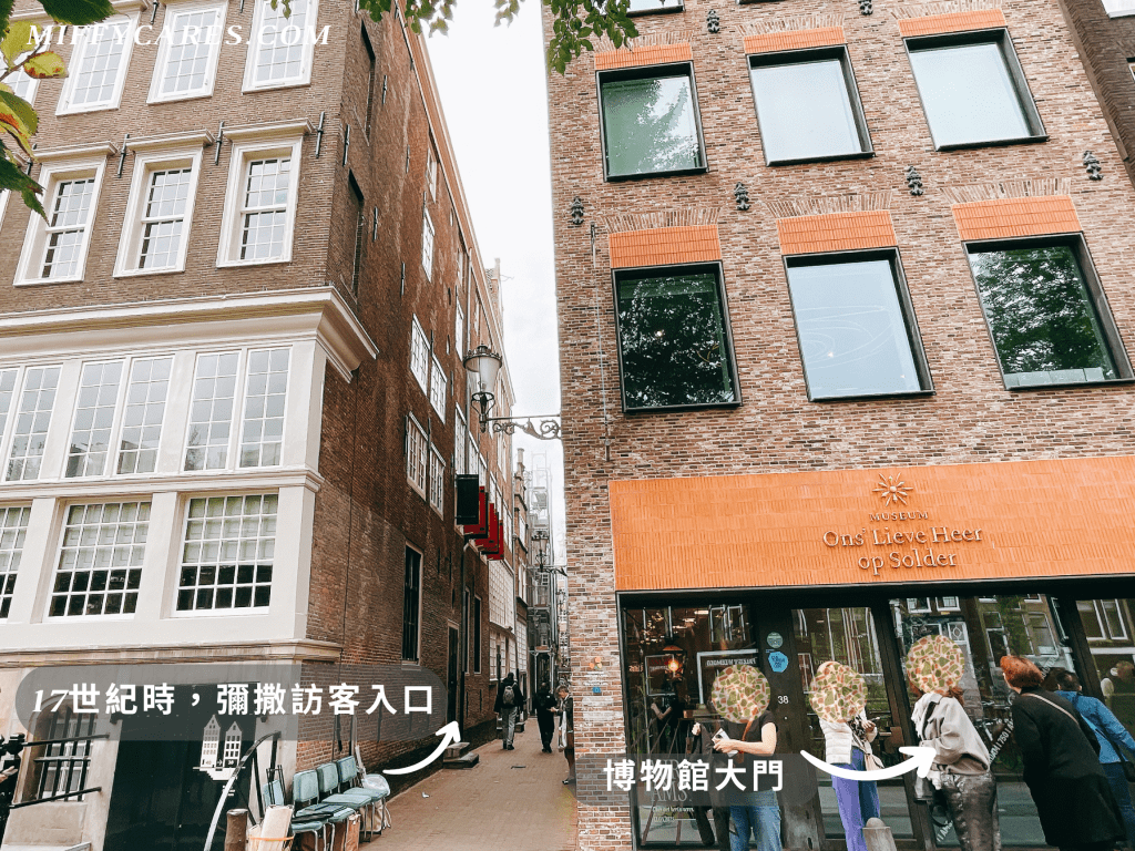 至於當時要來這裡做彌撒的信徒訪客們,得走位於Heintje Hoekssteeg巷子裡的側門(也就是電影《愛在牛津的一年》男女主角敲的那扇門)再爬樓梯上閣樓教堂。不過,目前【閣樓上的吾教堂主教堂】博物館入口在圖中右側,側門不開放。