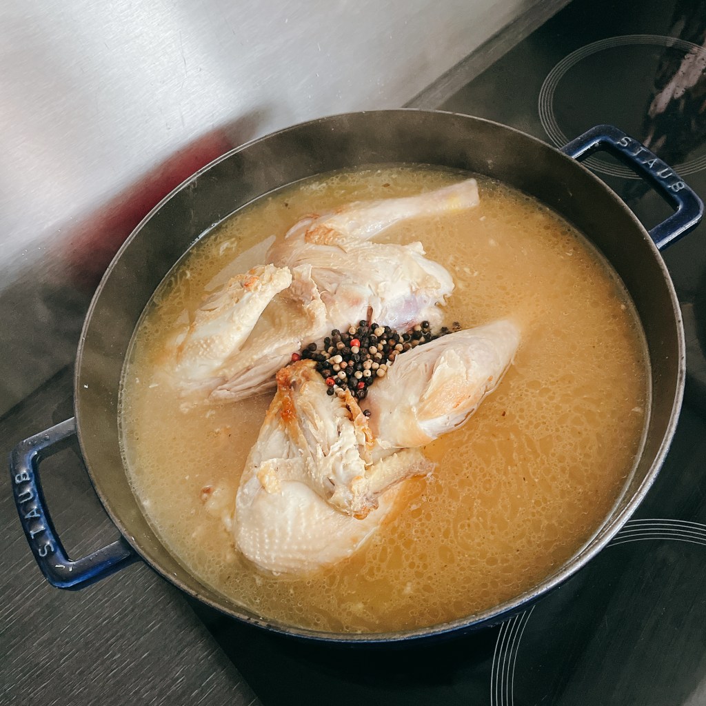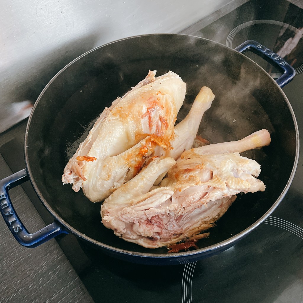 最後,把雞肉、蒜泥、四色胡椒粒(2大匙)和水(1000cc,或可淹過食材的量)加入STAUB鑄鐵鍋裡,煮滾後轉中小火,蓋鍋蓋悶煮30分鐘。