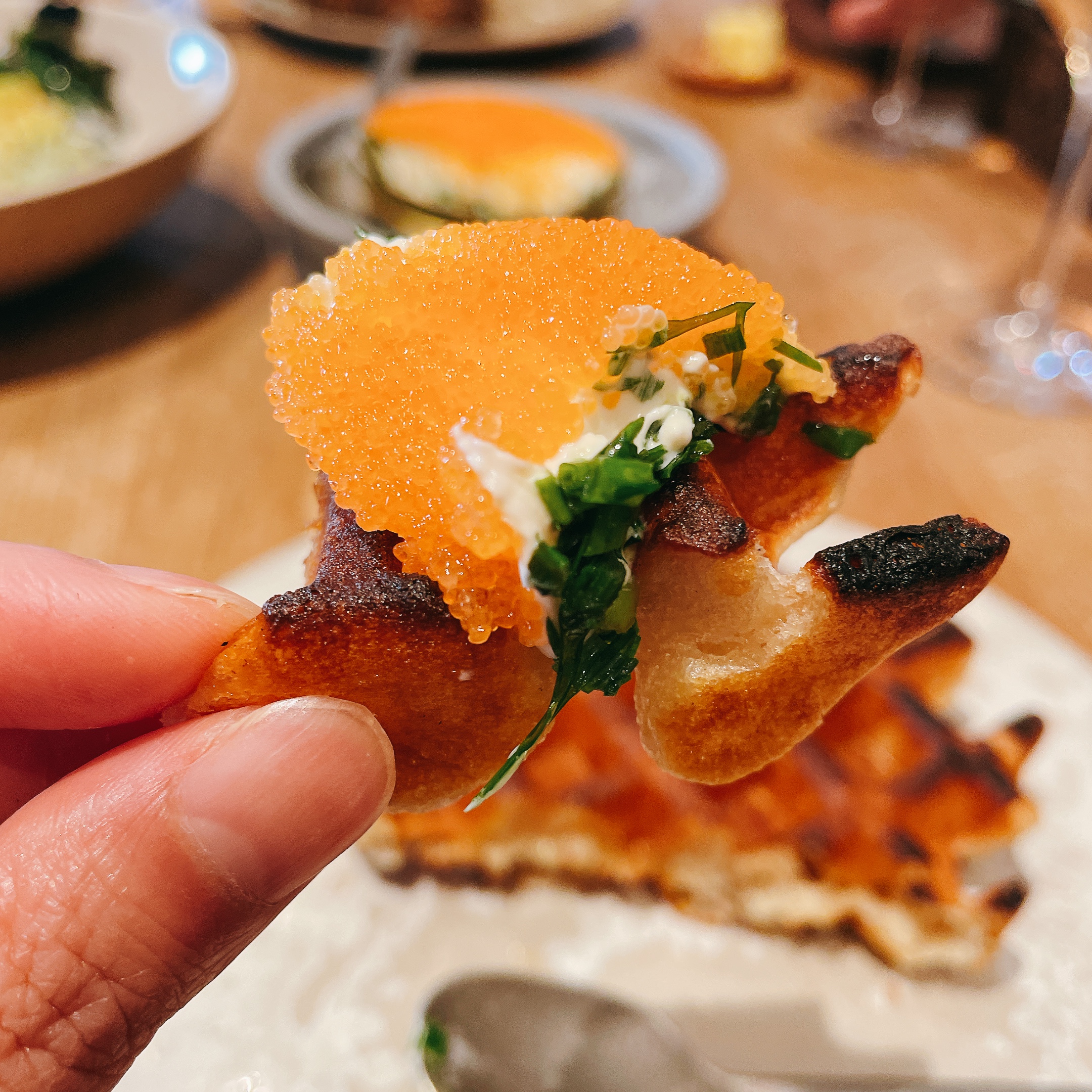 舀一匙冰涼涼的鮮奶油抹醬放在酥脆的鬆餅上,鱈魚子還會在嘴巴裡嗶嗶波波跳舞,我覺得是我吃過最有趣的鬆餅沒有之一!