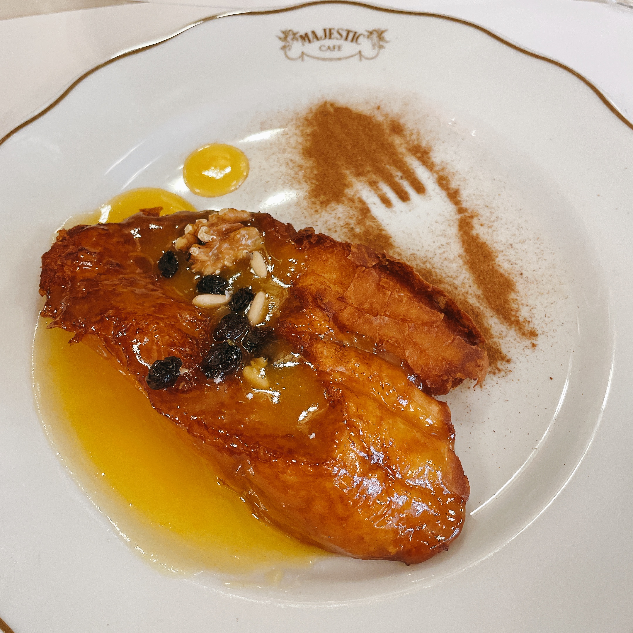 在葡萄牙旅行的每一天,下午三點一刻我不喝「下午茶」,但一定會點杯「下午波特酒」配甜點。【Majestic Cafe】的法式吐司是把法棍泡在牛奶蛋液裡,再用奶油煎到外層酥脆後,最後淋上甜滋滋的糖漿。